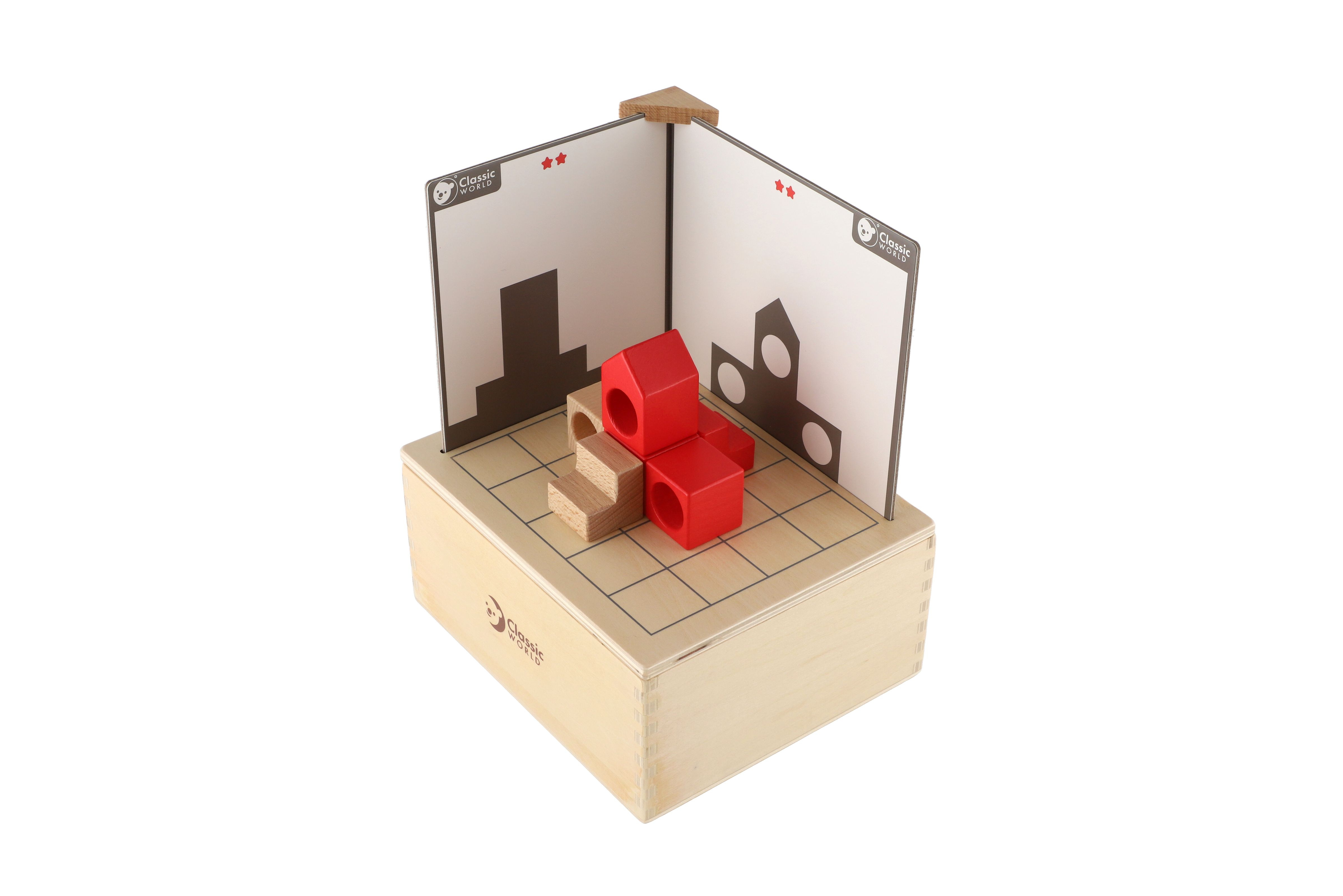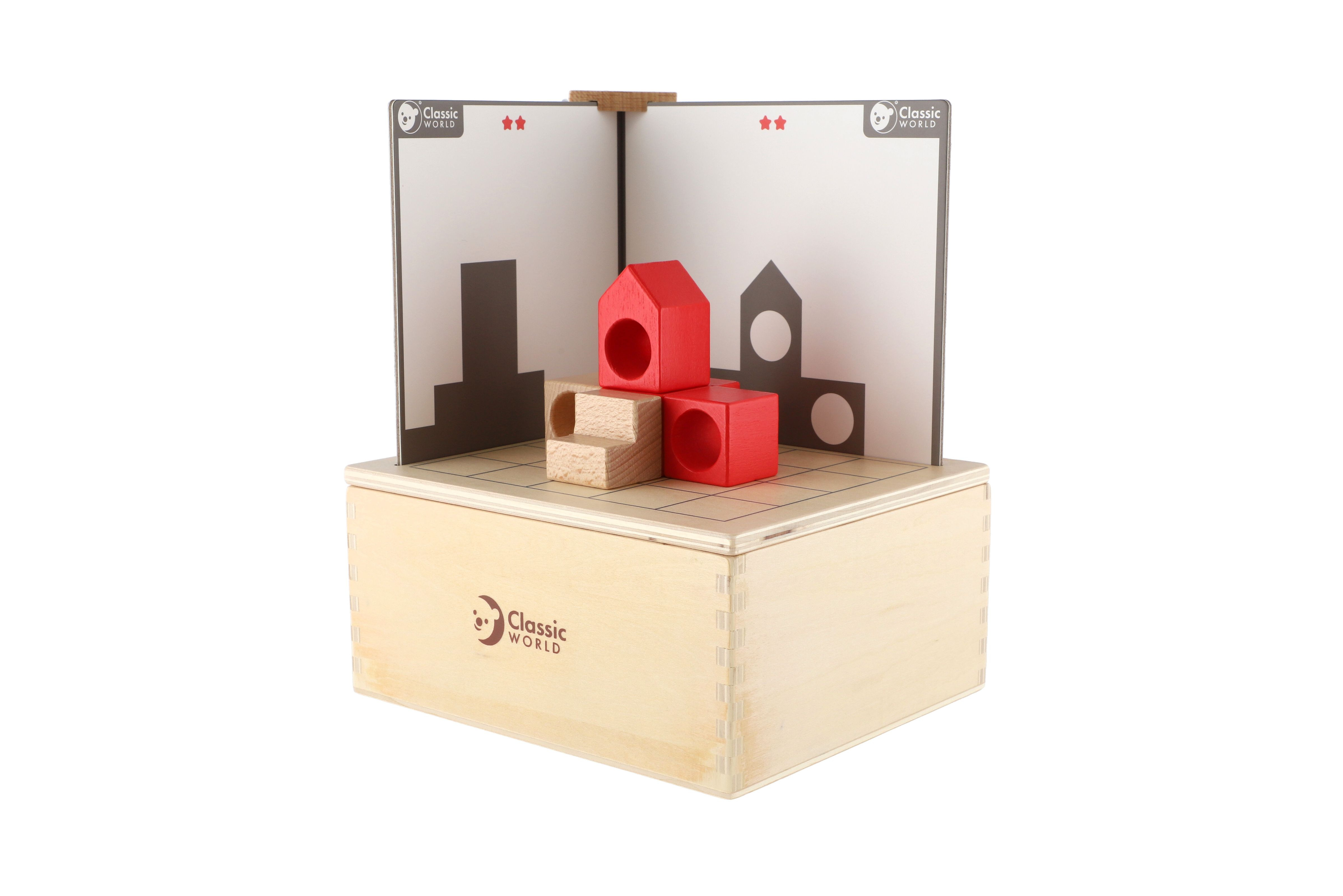 Tato sada bloků procvičí prostorovou orientaci dětí a schopnost logického myšlení. Sada využívá inspiraci ze světelné projekce. Děti pomocí svého prostorového myšlení sestaví blok podle kartičky a musí sladi obě strany. Karty jsou od jednoduchých až po obtížné úrovně. Balení obsahuje 41 dřevěných dílků a 14 karet. Rozměr dřevěné krabičky: 18,5 x 16 x 9 cm Vhodné pro děti od 3 let