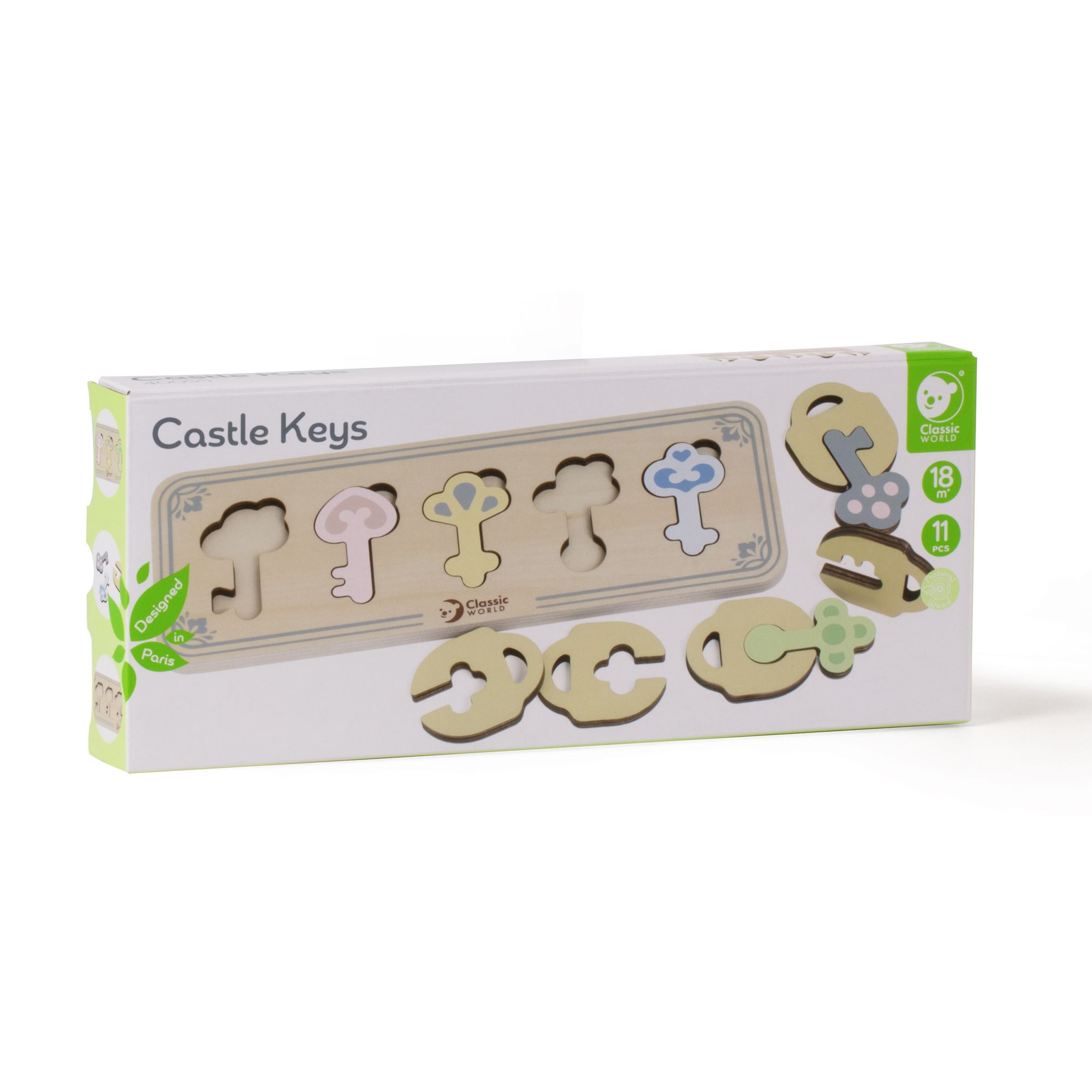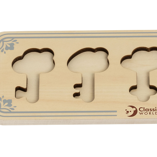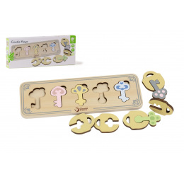 Dřevěné puzzle pro děti skládající se z dřevěného rámečku s výřezy ve tvaru klíčů, dřevěných klíčů a dřevěných zámků je vkládacím puzzle, které potrénuje motorické dovednosti, koordinaci očí a rukou, zrakové vnímání a potrápí dětskou mysl. Součastí balení je 11 kusů.¨ Rozměr balení: 29 x 12 x 4 cm Vhodné pro děti od 18 měsíců