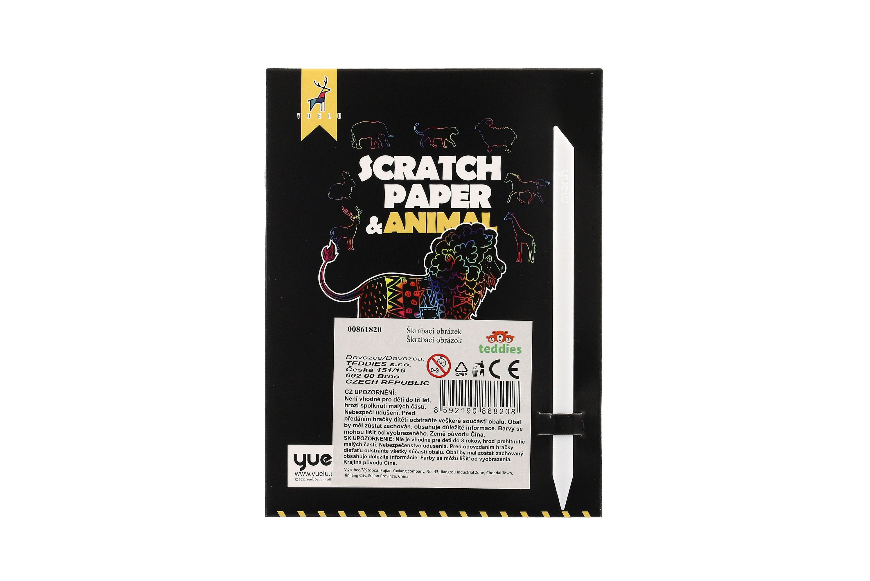 Škrabací obrázek, kde perem šeškrábete dle vlastní fantazie zvíře. Doškrabejte mu např. srst, obličej atp. Dítě nakonec získá obrázek, kterým si může vyzdobit pokojíček, přičemž samo získá mnoho potřebných dovedností, jako je pozornost, trpělivost, opatrnost a přispěje k rozvoji tvořivého talentu a motoriky. Sada obsahuje 8 obrázků zvířat. Rozměry balení 13 x 16 x 0,5 cm. Vhodné pro děti od 3 let.