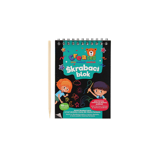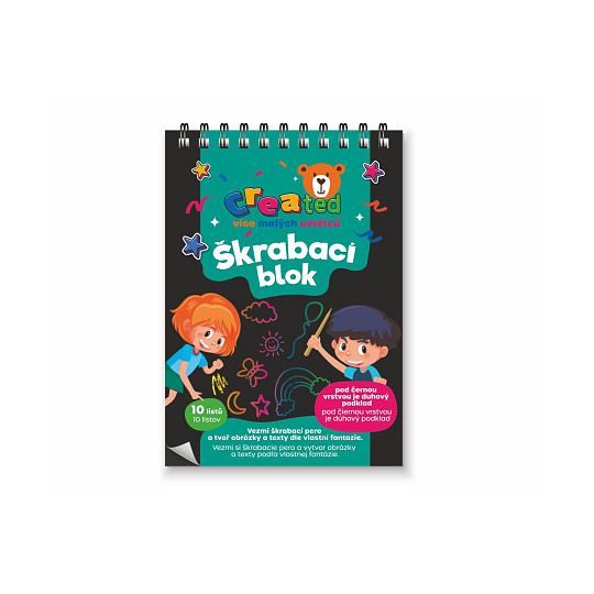 Každý tah škrabacím perem odhalí tajemství – ukrytý duhový podklad, který čeká jen na dětskou fantazii. Malování nikdy nebylo tak zábavné a magické! 10 listů plných překvapení. Černá vrstva s duhovým pozadím – každé škrábnutí vykouzlí barvy. Ideální pro kresby, vzkazy, přáníčka i skrytá poselství. Vezmi škrabací pero a nech vzniknout příběhy a obrázky, které vznikají jen v dětské hlavě.