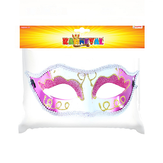 Růžovo-bílá elegantní škraboška na gumičku! Tento kousek je dekorován třpytivými malůvkami a lemován stříbrnou krajkou.