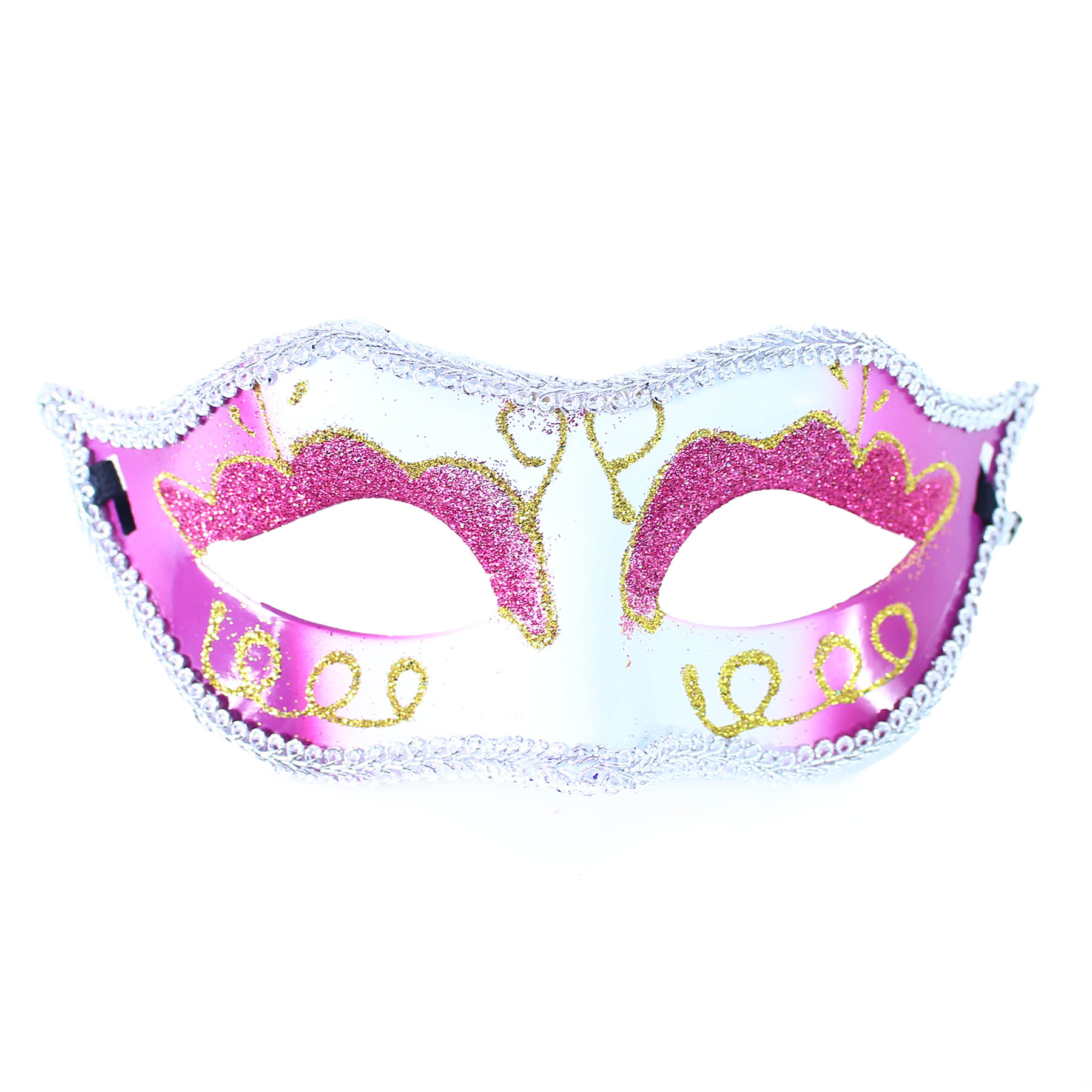 Růžovo-bílá elegantní škraboška na gumičku! Tento kousek je dekorován třpytivými malůvkami a lemován stříbrnou krajkou.