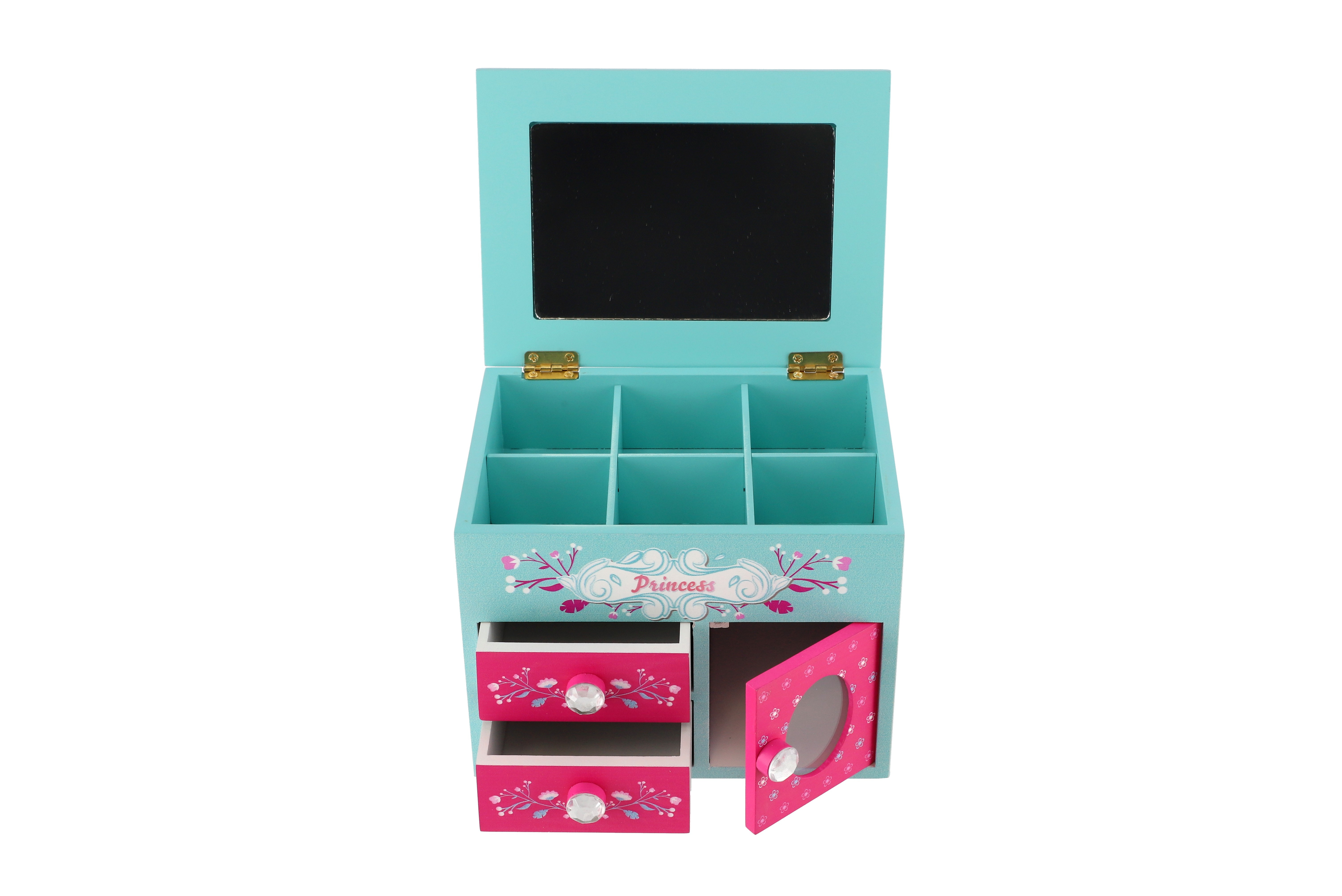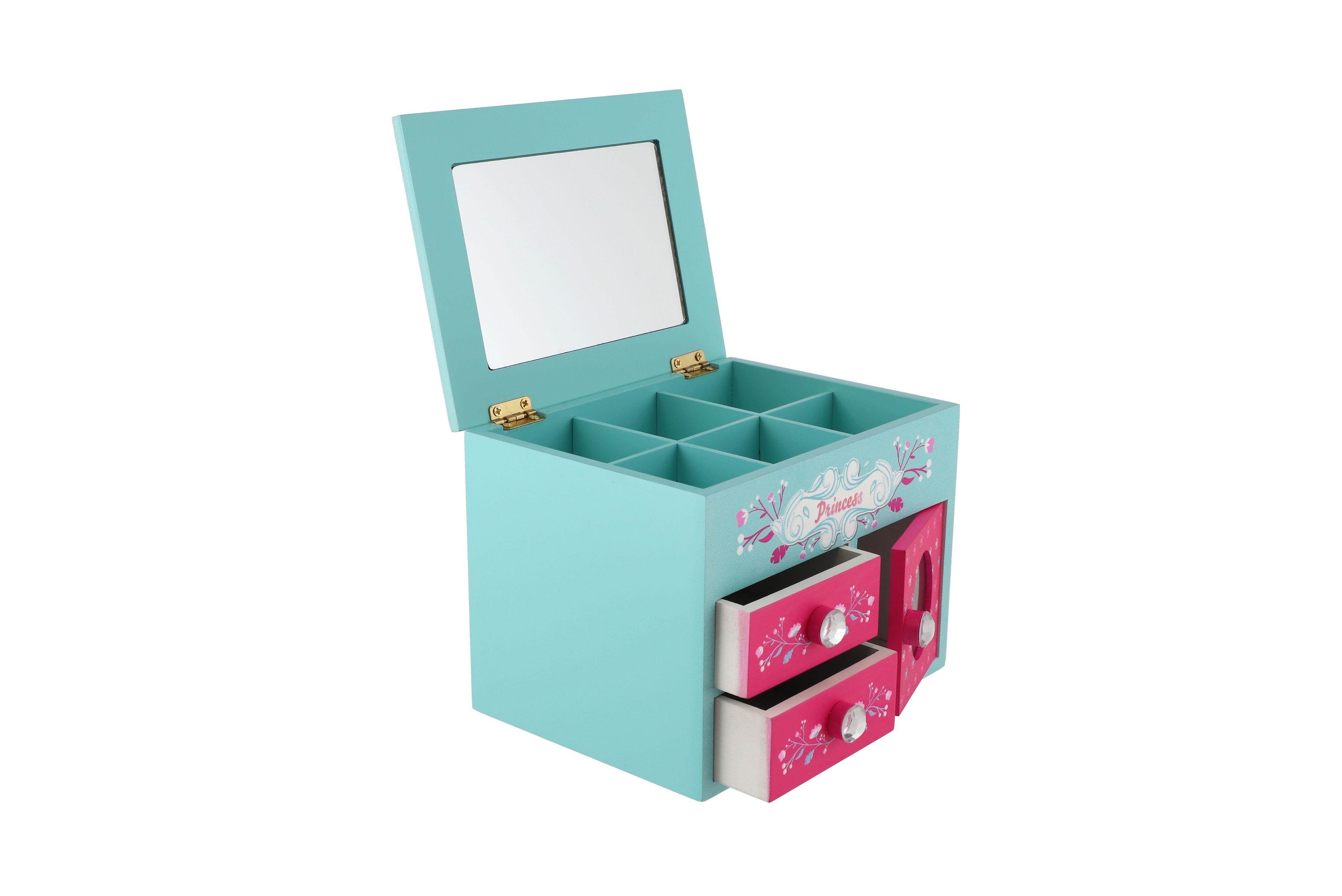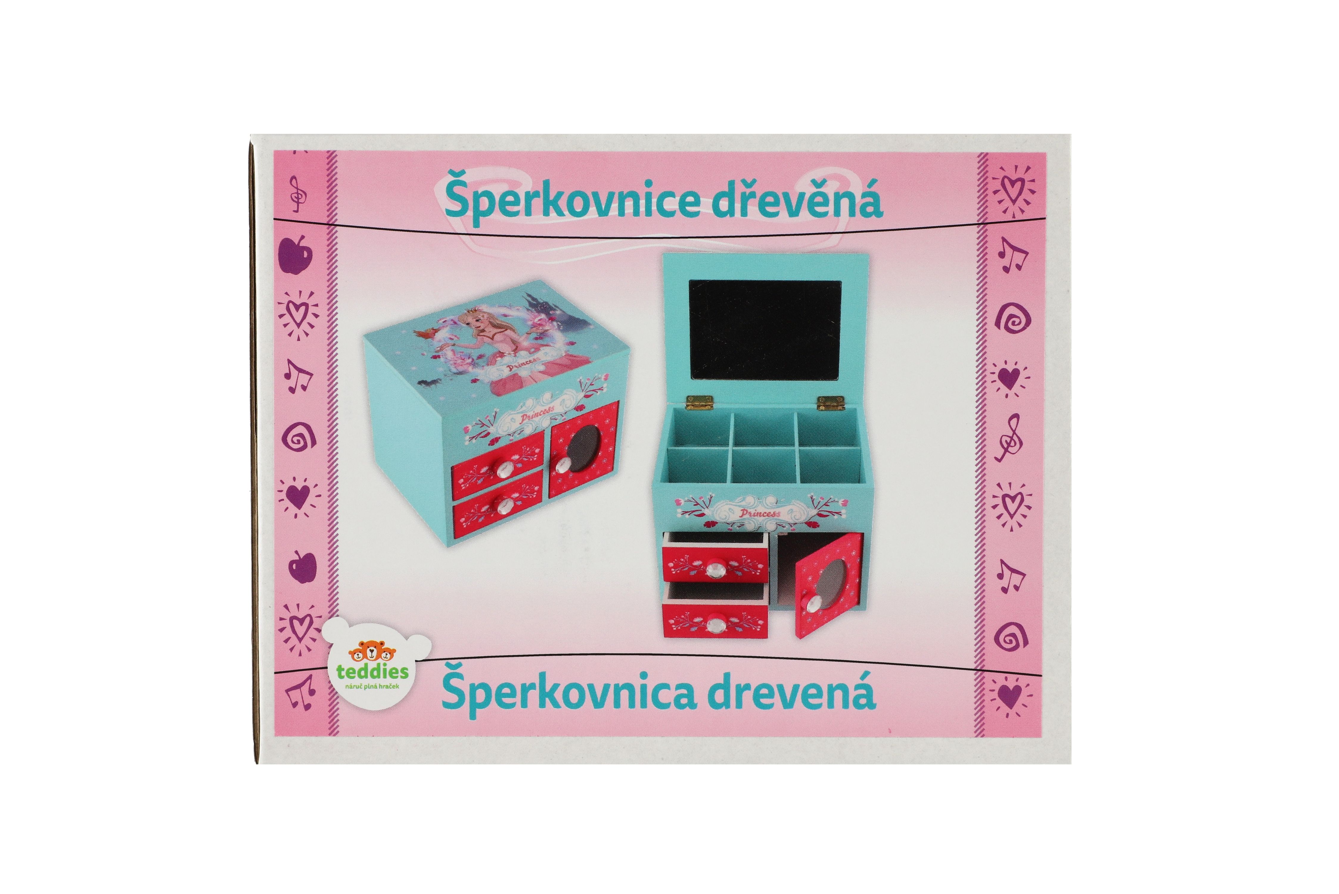 Skříňka šperkovnice Princess 3 zásuvky odklápěcí vrch se zrcátkem dřevo 16x12,5x12cm v krabici
