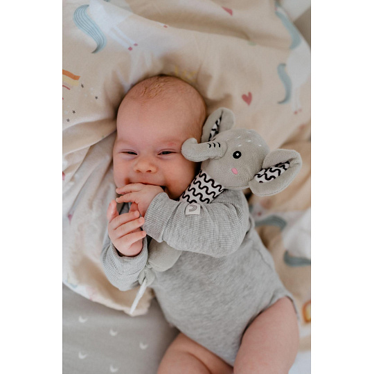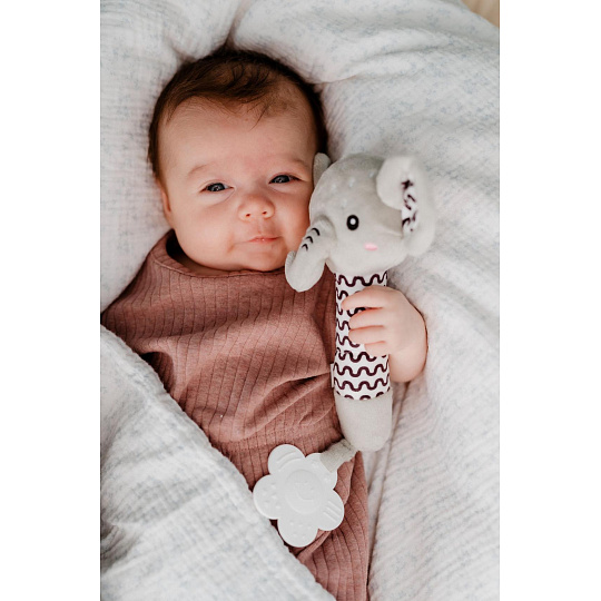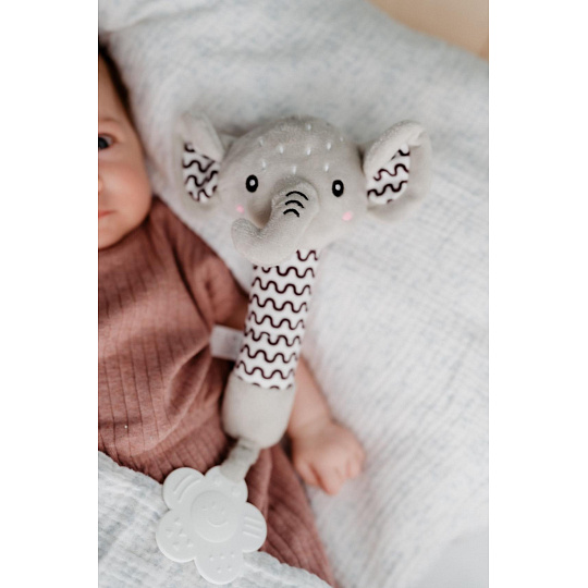 Roztomilý plyšový sloník je ideální první hračka pro miminka již od narození. Měkké tělo sloníka se lehce drží v malých ručičkách a při stisku vydává jemný pískací zvuk, který podporuje sluchový rozvoj a přirozeně upoutává pozornost miminka. Na konci držátka je umístěno měkké plastové kousátko ve tvaru kytičky, které pomáhá ulevit citlivým dásním při prořezávání zoubků. Kontrastní vzory na tělíčku a ouškách podporují vizuální vnímání dítěte. Sloník je vyroben z hebkého a bezpečného plyše, který je vhodný pro nejmenší děti. Certifikováno v ČR, což zaručuje splnění přísných bezpečnostních norem.
