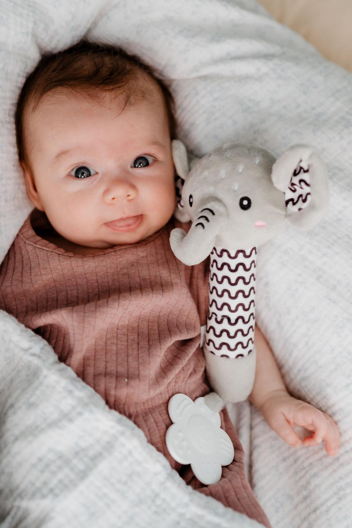 Roztomilý plyšový sloník je ideální první hračka pro miminka již od narození. Měkké tělo sloníka se lehce drží v malých ručičkách a při stisku vydává jemný pískací zvuk, který podporuje sluchový rozvoj a přirozeně upoutává pozornost miminka. Na konci držátka je umístěno měkké plastové kousátko ve tvaru kytičky, které pomáhá ulevit citlivým dásním při prořezávání zoubků. Kontrastní vzory na tělíčku a ouškách podporují vizuální vnímání dítěte. Sloník je vyroben z hebkého a bezpečného plyše, který je vhodný pro nejmenší děti. Certifikováno v ČR, což zaručuje splnění přísných bezpečnostních norem.