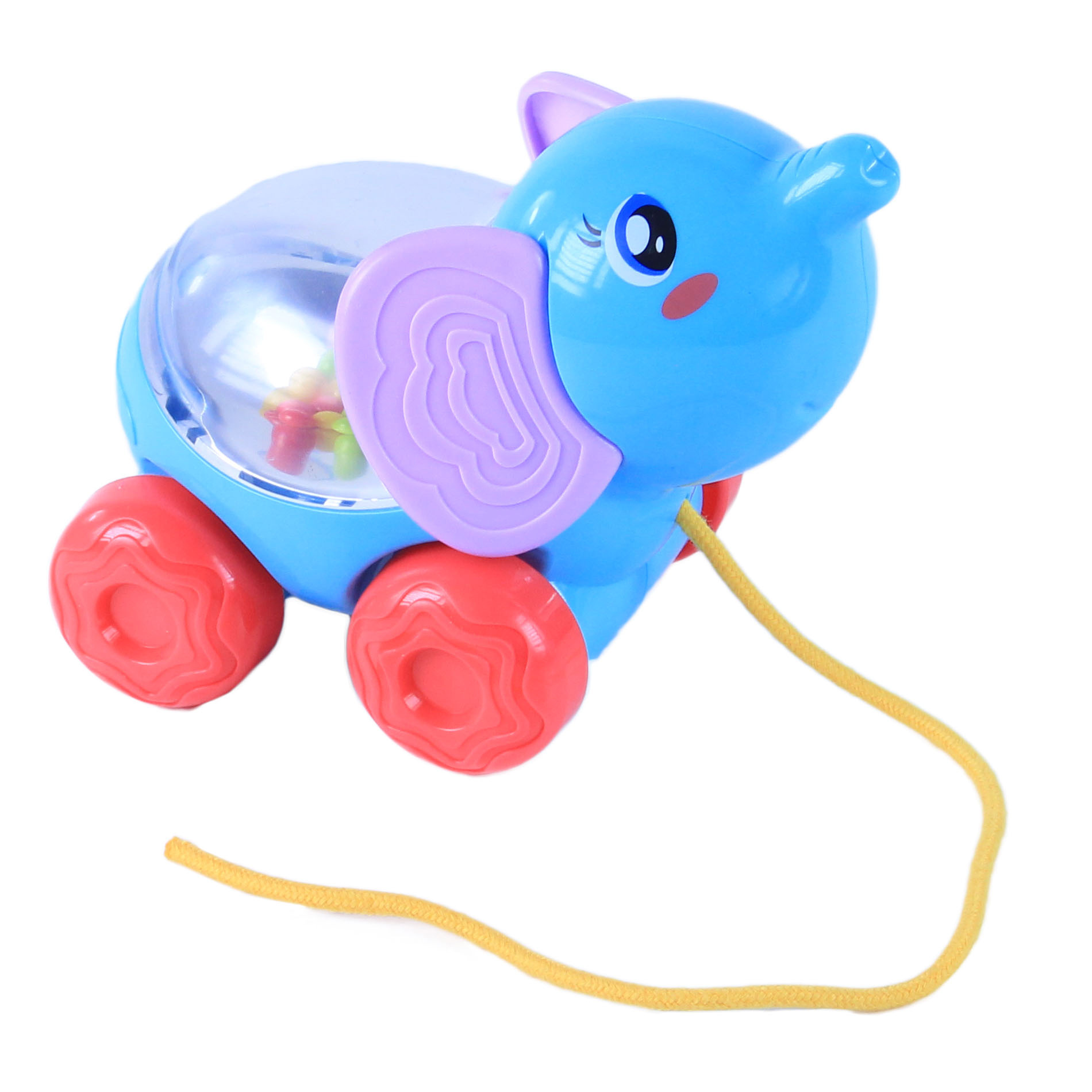 Veselé zvířátko slon na kolečkách s barevnými kuličkami. Taháním či pohybem zvířátka začnou kuličky uvnitř poskakovat. Tato hračka zaujme a pobaví i ty nejmenší děti.