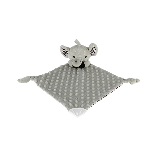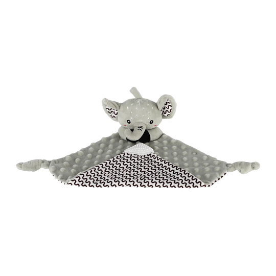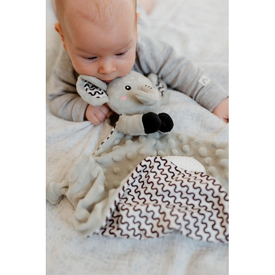 Heboučký plyšový usínáček v podobě milého sloníka je ideálním společníkem pro miminka již od narození. Vyrobený z měkoučkého minky materiálu s 3D puntíky poskytuje příjemný a uklidňující dotek, který pomáhá děťátku usínat a cítit se bezpečně. Uvnitř je ukryté jemné chrastítko, které podporuje sluchový rozvoj dítěte. Jeden z rohů je doplněn o měkké silikonové kousátko, které uleví od bolesti při prořezávání zoubků. Uzlíky na rozích navíc stimulují hmat a jsou snadno uchopitelné i pro nejmenší ručičky. Certifikováno v ČR, splňuje tak vysoké standardy bezpečnosti pro novorozence.
