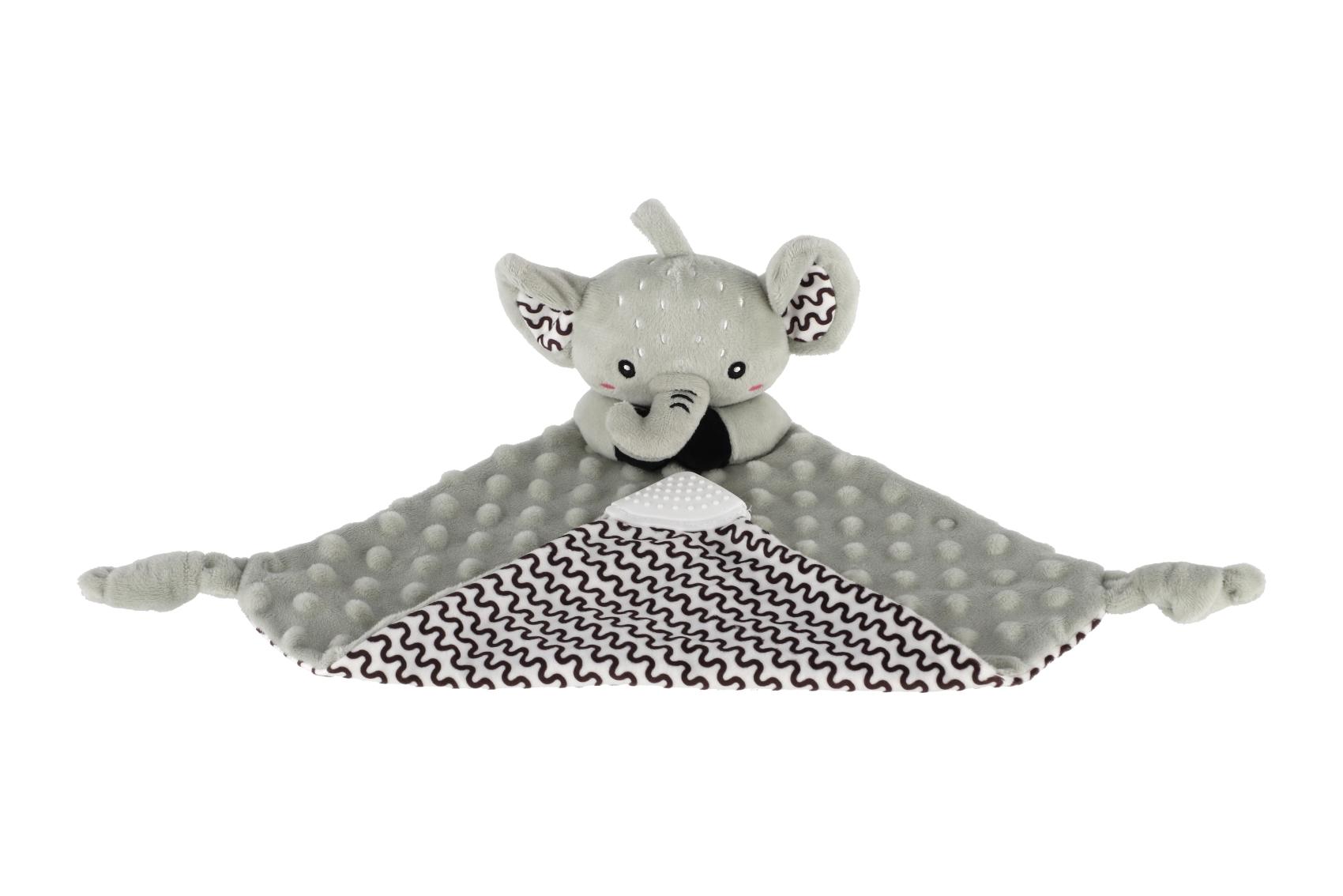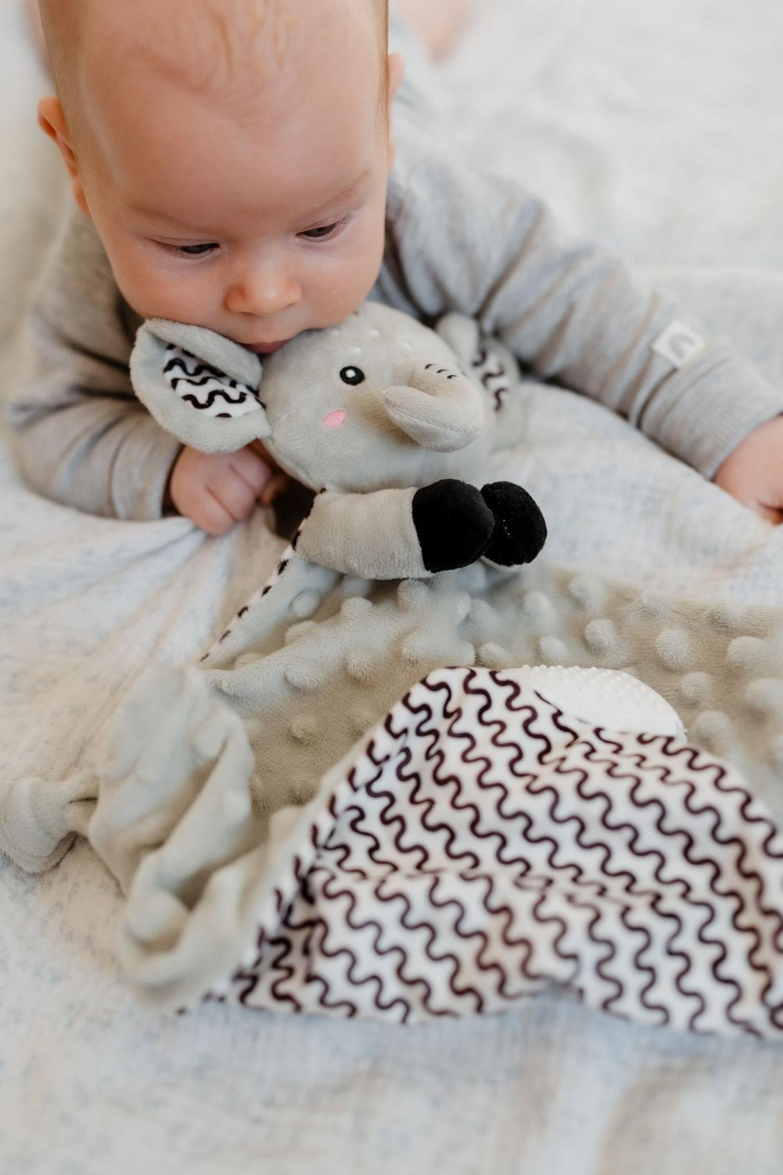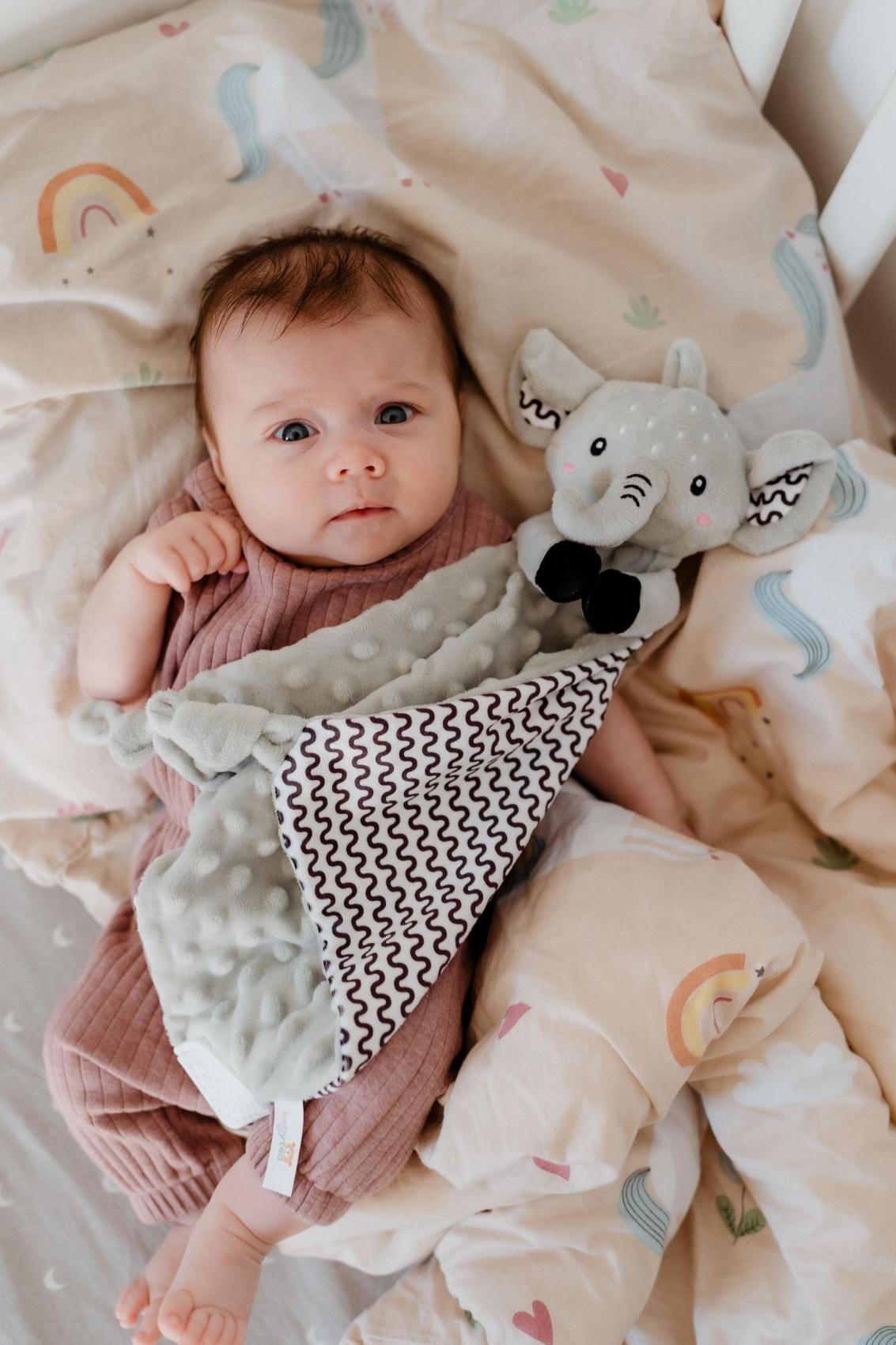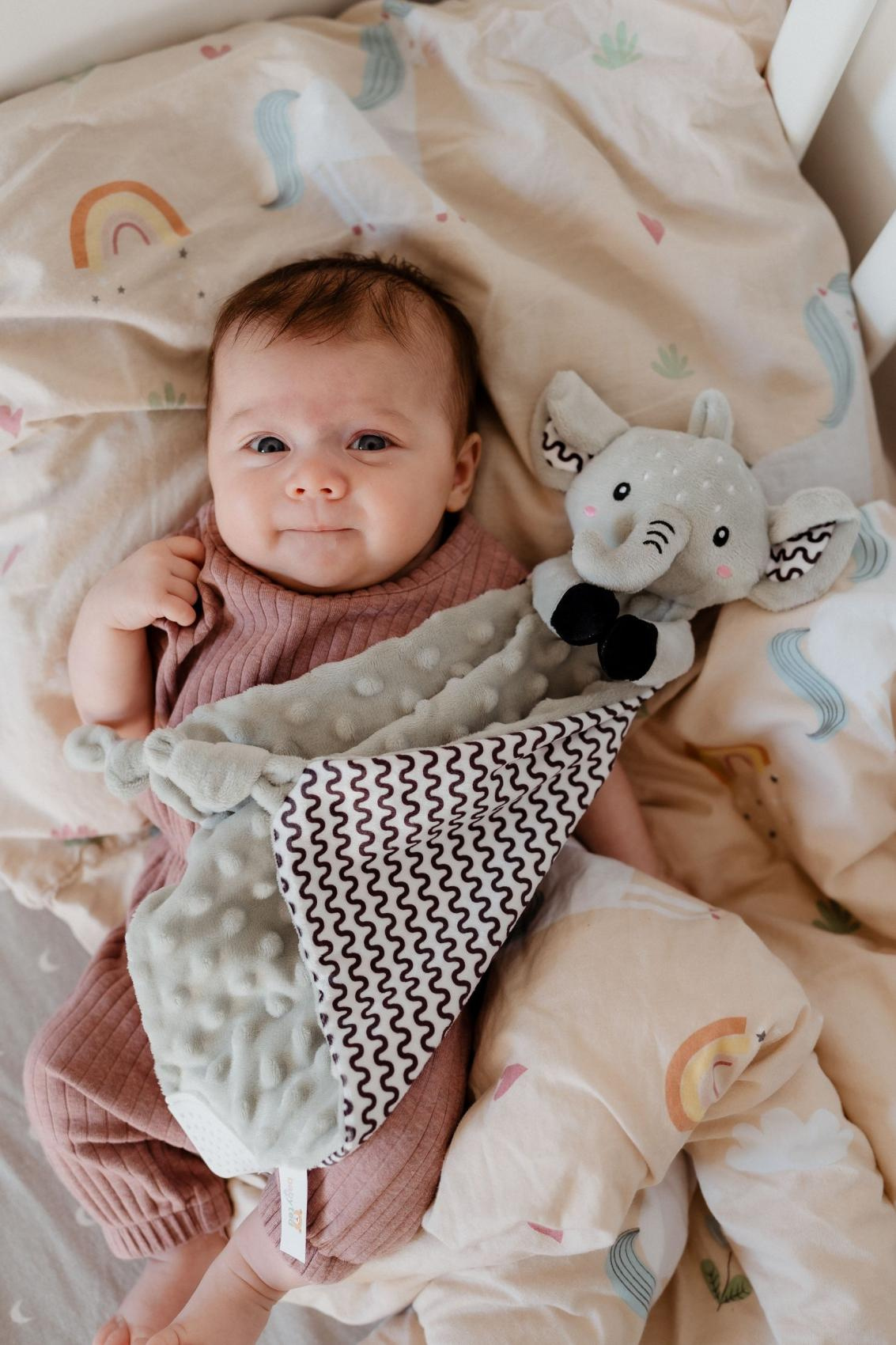 Heboučký plyšový usínáček v podobě milého sloníka je ideálním společníkem pro miminka již od narození. Vyrobený z měkoučkého minky materiálu s 3D puntíky poskytuje příjemný a uklidňující dotek, který pomáhá děťátku usínat a cítit se bezpečně. Uvnitř je ukryté jemné chrastítko, které podporuje sluchový rozvoj dítěte. Jeden z rohů je doplněn o měkké silikonové kousátko, které uleví od bolesti při prořezávání zoubků. Uzlíky na rozích navíc stimulují hmat a jsou snadno uchopitelné i pro nejmenší ručičky. Certifikováno v ČR, splňuje tak vysoké standardy bezpečnosti pro novorozence.