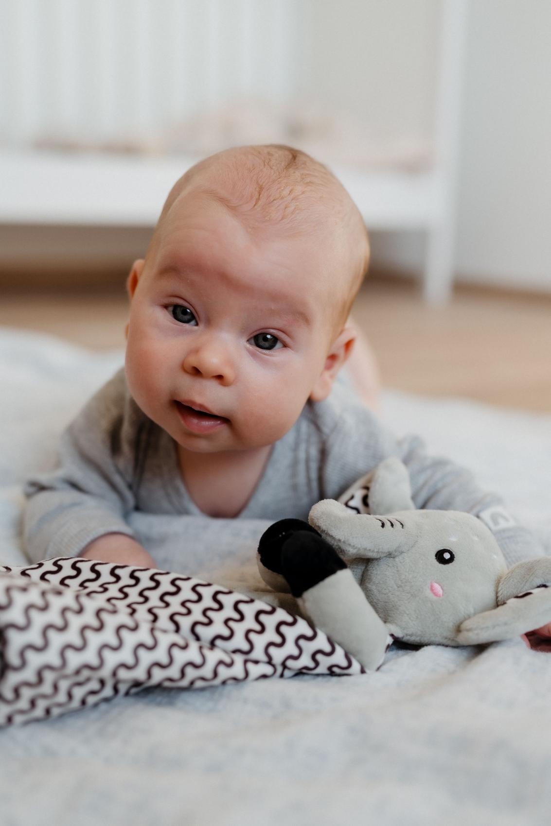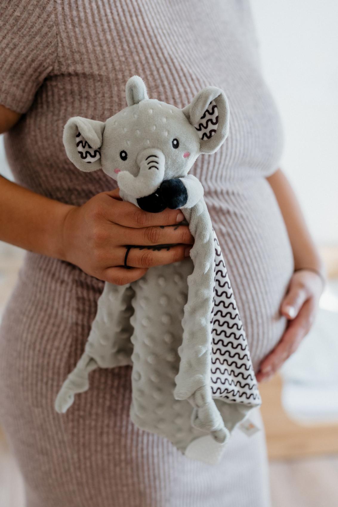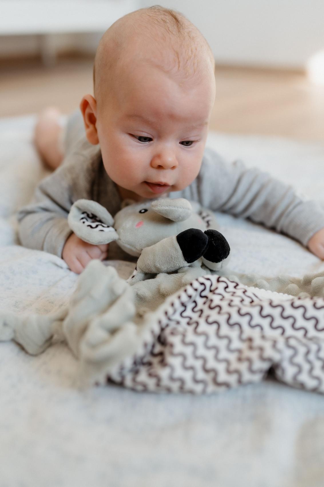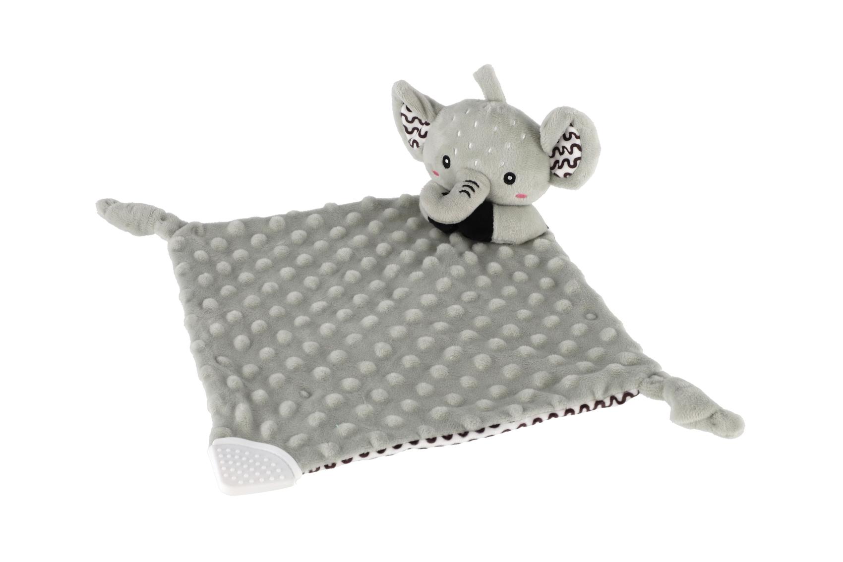 Heboučký plyšový usínáček v podobě milého sloníka je ideálním společníkem pro miminka již od narození. Vyrobený z měkoučkého minky materiálu s 3D puntíky poskytuje příjemný a uklidňující dotek, který pomáhá děťátku usínat a cítit se bezpečně. Uvnitř je ukryté jemné chrastítko, které podporuje sluchový rozvoj dítěte. Jeden z rohů je doplněn o měkké silikonové kousátko, které uleví od bolesti při prořezávání zoubků. Uzlíky na rozích navíc stimulují hmat a jsou snadno uchopitelné i pro nejmenší ručičky. Certifikováno v ČR, splňuje tak vysoké standardy bezpečnosti pro novorozence.