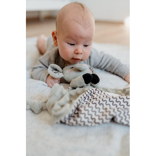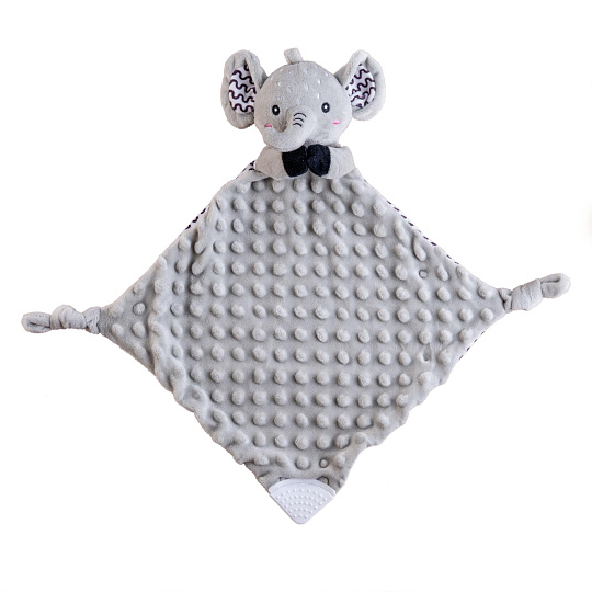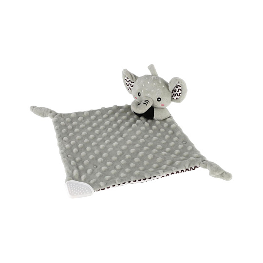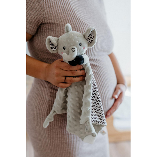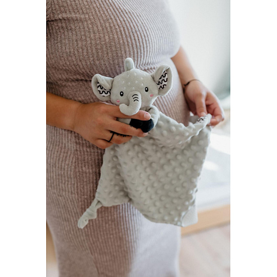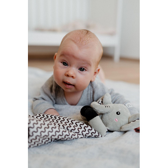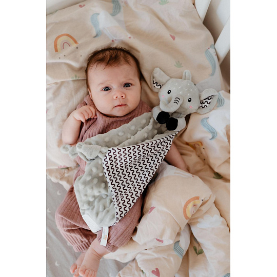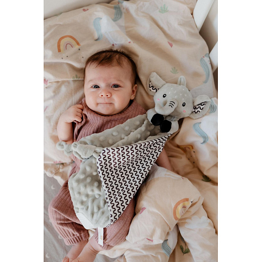 Heboučký plyšový usínáček v podobě milého sloníka je ideálním společníkem pro miminka již od narození. Vyrobený z měkoučkého minky materiálu s 3D puntíky poskytuje příjemný a uklidňující dotek, který pomáhá děťátku usínat a cítit se bezpečně. Uvnitř je ukryté jemné chrastítko, které podporuje sluchový rozvoj dítěte. Jeden z rohů je doplněn o měkké silikonové kousátko, které uleví od bolesti při prořezávání zoubků. Uzlíky na rozích navíc stimulují hmat a jsou snadno uchopitelné i pro nejmenší ručičky. Certifikováno v ČR, splňuje tak vysoké standardy bezpečnosti pro novorozence.
