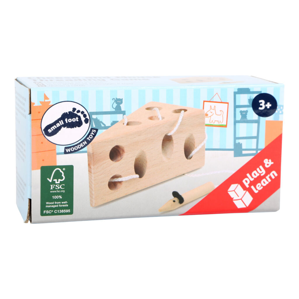 Kdo se to prokousal sýrem? Přeci malá myška! Tato krásná provlékací hra je vyrobena z přírodního lakovaného a 100% FSC certifikovaného bukového dřeva. Trénuje motoriku a trpělivost. S trochou zručnosti provlečete myšku hravě celým sýrem, procvičíte si prsty a jemnou motoriku. Hlavní vlastnosti:•trénuje motoriku, zručnost•100% FSC dřevo