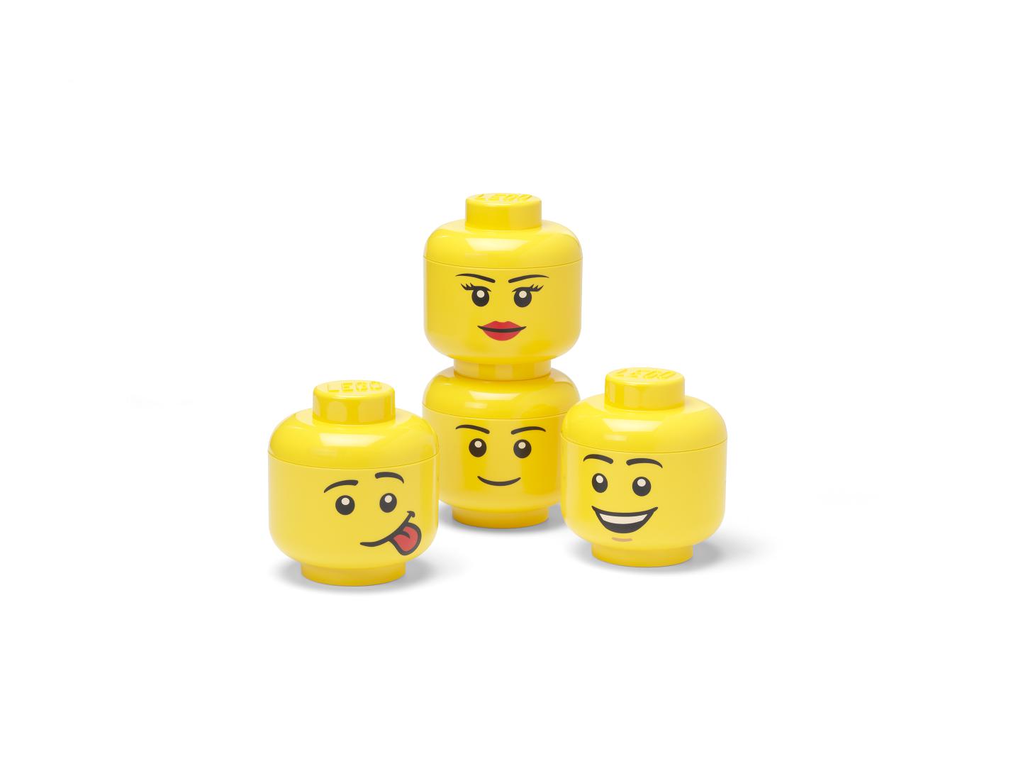 LEGO mini hlavy jsou stohovatelné a perfektně sednou i na LEGO stolní boxy se zásuvkou.