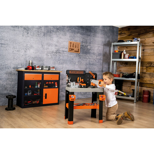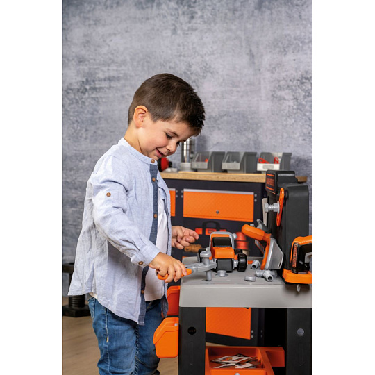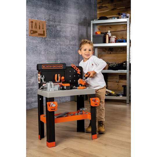 Realistické centrum pracovního stolu Smoby Black+Decker s 83 díly příslušenství , 7 nástroji a vozidlem . Velký, robustní pracovní stůl vypadá jako skutečný tátův pracovní stůl. Velká pracovní plocha v dřevěném designu nabízí dostatek prostoru pro různé nářadí. Mechanickým akumulátorovým šroubovákem lze ze stavebních bloků sešroubovat různá vozidla. Vybavení je doplněno šroubovou svorkou a posuvným pravítkem. Spousta úložných přihrádek na šrouby a hřebíky. Se zábavnou zatloukací funkcí hřebíků. Tento výrobek obsahuje minimálně 65 % recyklovaného materiálu. Rozměry produktu (DxŠxV): 36 x 57,5 x 75 cm.