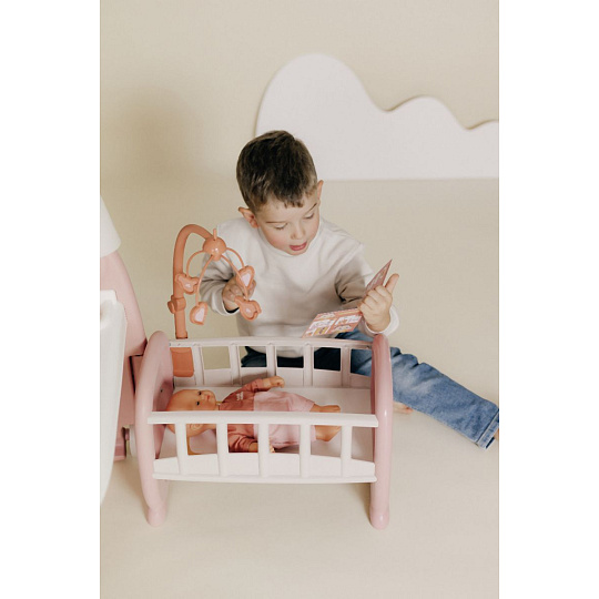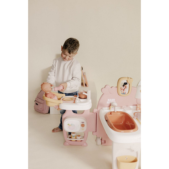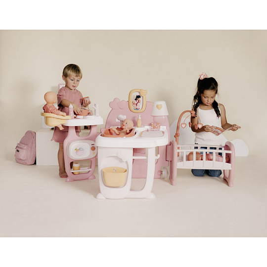 Hrací centrum pro panenky Baby Nurse se 3 hracími zónami je vybaveno transportními kolečky, rukojetí a je skládací pro snadnou přepravu. Po otevření překvapí třemi prostornými hracími koutky: kuchyňkou, koupelnou a ložnicí. Mycí prostor je vybaven odnímatelnou vaničkou, hned vedle je přebalovací pult, který zároveň slouží jako šatna. Pod komodou je věšák na ručníky, háček na kabát a vyjímatelný odpadkový koš. Rám obrazu na zadní stěně lze přizpůsobit vlastními fotografiemi. Jídelní kout se sedátkem pro panenky má dřez s baterií (nefunkční), varnou desku, mikrovlnnou troubu a odkládací police. Spací část obsahuje postýlku pro panenky, otočný kolotoč a fosforeskující lampu. Příslušenství: lahvičky, talíře se lžičkami, hrnce, klinické teploměry a různé nádoby a prázdné obaly na hraní. Vhodné pro panenky do 42 cm (panenka není součástí balení). Tento výrobek obsahuje minimálně 78 % recyklovaného materiálu. Rozměry složeného produktu (DxŠxV): 68 x 71 x 71 cm. Rozměry produktu v rozloženém stavu (DxŠxV): 149 x 71 x 71 cm.