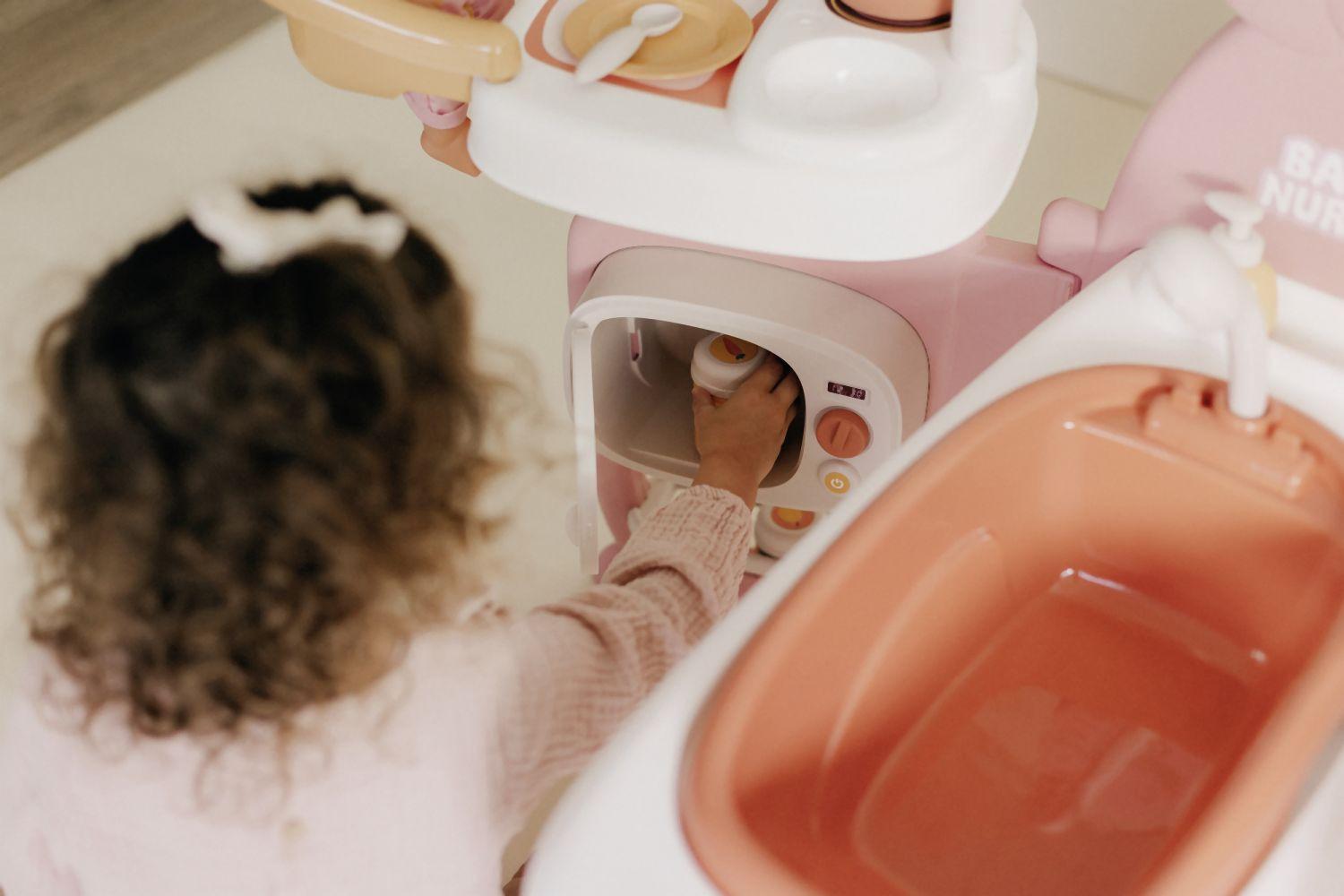 Hrací centrum pro panenky Baby Nurse se 3 hracími zónami je vybaveno transportními kolečky, rukojetí a je skládací pro snadnou přepravu. Po otevření překvapí třemi prostornými hracími koutky: kuchyňkou, koupelnou a ložnicí. Mycí prostor je vybaven odnímatelnou vaničkou, hned vedle je přebalovací pult, který zároveň slouží jako šatna. Pod komodou je věšák na ručníky, háček na kabát a vyjímatelný odpadkový koš. Rám obrazu na zadní stěně lze přizpůsobit vlastními fotografiemi. Jídelní kout se sedátkem pro panenky má dřez s baterií (nefunkční), varnou desku, mikrovlnnou troubu a odkládací police. Spací část obsahuje postýlku pro panenky, otočný kolotoč a fosforeskující lampu. Příslušenství: lahvičky, talíře se lžičkami, hrnce, klinické teploměry a různé nádoby a prázdné obaly na hraní. Vhodné pro panenky do 42 cm (panenka není součástí balení). Tento výrobek obsahuje minimálně 78 % recyklovaného materiálu. Rozměry složeného produktu (DxŠxV): 68 x 71 x 71 cm. Rozměry produktu v rozloženém stavu (DxŠxV): 149 x 71 x 71 cm.