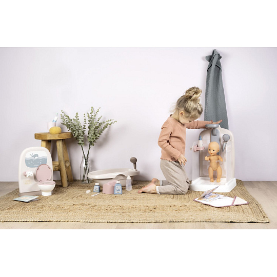Sprchový kout pro panenky Baby Nurse s funkční sprchovou hlavicí, funkce proudu vody díky čerpadlu a nádrži na vodu. Sprcha má držák na ručník, háčky na župany, poličku, pevnou sprchu, hlavici a řada dalšího příslušenství. Vhodné pro panenky do 40 cm (panenka není součástí balení). Rozměry produktu (DxŠxV): 30,9 x 29,9 x 46,6 cm. Hmotnost 1,845 kg.