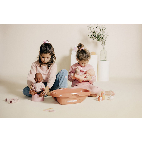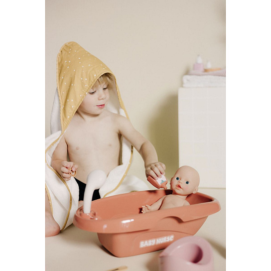 Vanička pro panenky Baby Nurse s odnímatelnou sprchovou hlavicí má mechanickou rotační funkci a usnadňuje mytí vlásků panenky. Součástí příslušenství je kromě lahvičky na mléko a zubního kartáčku také nočník, klinický teploměr, náramek a 2 lahvičky s pečujícím příslušenstvím. Vhodné pro panenky do 42 cm (panenka není součástí balení). Tento výrobek obsahuje minimálně 76 % recyklovaného materiálu. Rozměry produktu (DxŠxV): 24 x 42 x 13 cm.
