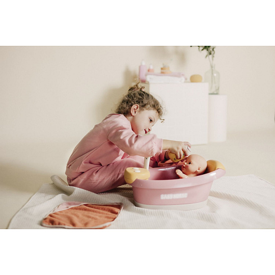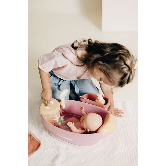 Vanička s opěrkou hlavy pro panenky Smoby Baby Nurse s elektronickou sprchou a bublinkovou funkcí se světlem. Z automatické sprchové hlavice vyteče skutečná voda pouhým stisknutím tlačítka. Vana má elektronický modul se 2 funkcemi: uzavřený okruh vodní trysky a bublifuk se světlem. Polička nabízí dostatek místa pro uložení vloženého příslušenství: osušky z bavlněného froté, lahvičky na šampón s pumpovací funkcí a teploměru ve tvaru velryby. Teploměr je citlivý na teplo, při kontaktu s vodou mění barvu. Vhodné pro panenky do 42 cm. Panenka není součástí balení. Rozměry (DxŠxV): 40 x 30 x 23 cm.