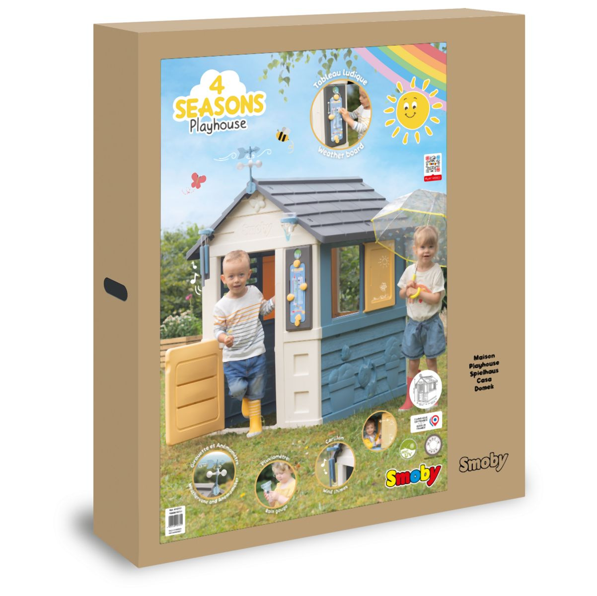 Stabilní, prostorný domeček Smoby Meteostanice. Součástí vybavení domečku je srážkoměr, větrná korouhvička/anemometr, zvonkohra a hravá tabulka, které dětem zajistí spustu zábavy, kreativity i učení. Domeček má malé vstupní dveře, 2 okna s lamelami a 2 posuvné okenice, které lze otevírat a zavírat. Snadná montáž. Módní barevné provedení v modré a žluté dodává herně svěží a moderní vzhled. Čtyři robustní boční stěny jsou navrženy velmi detailně, fasádu domu zdobí květiny v květináčích, zvířatka a motýlci, kteří vytvářejí zábavný design. Domeček je vyroben z vysoce kvalitního plastu odolného vůči UV záření a je zvláště odolný vůči povětrnostním vlivům a vyblednutí. Rozměry produktu (DxŠxV): 102,7 x 121,8 x 143,4 cm. Výška samotného domečku je 127 cm, výška s větrnou korouhvičkou je 147,5 cm.