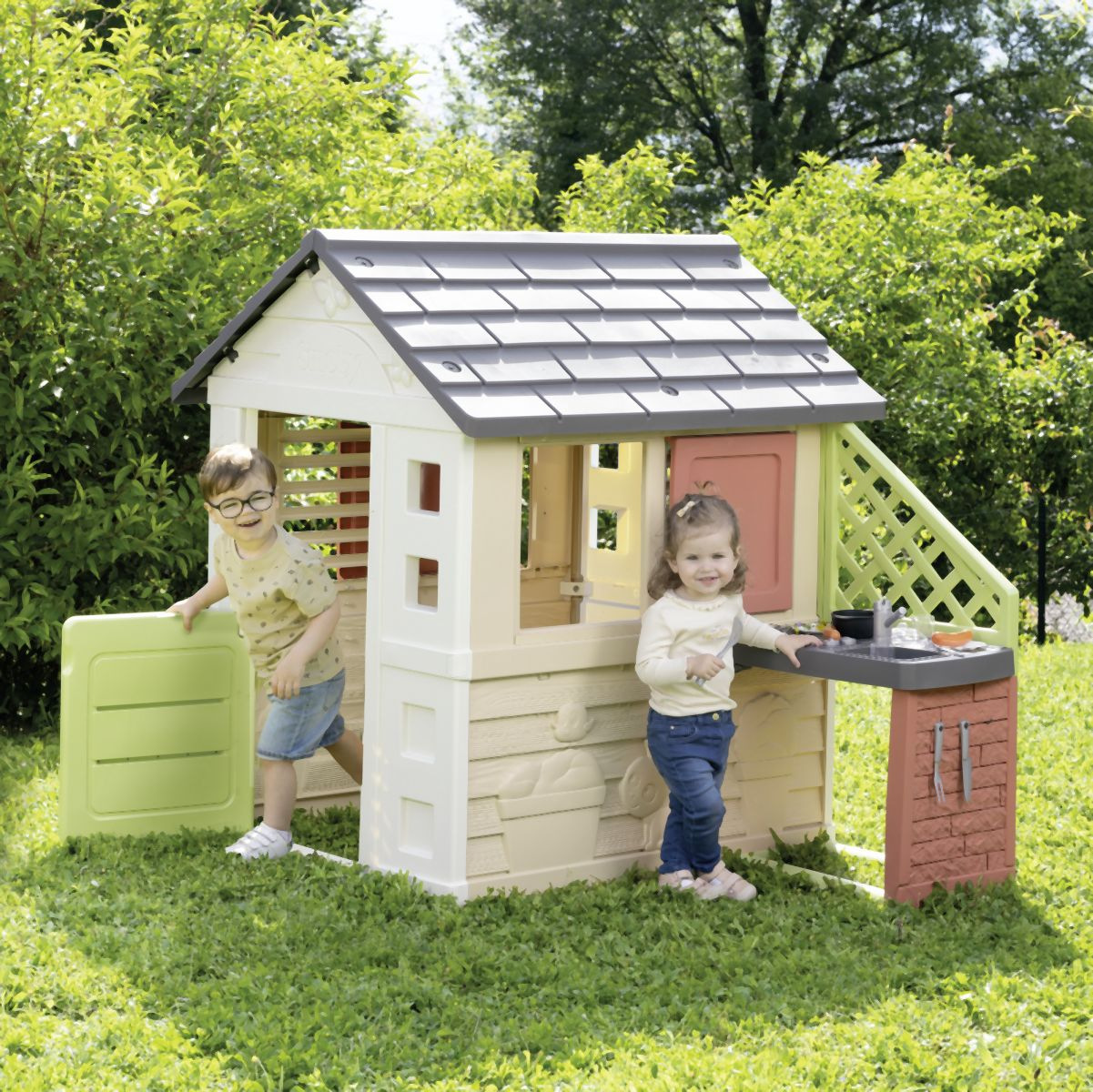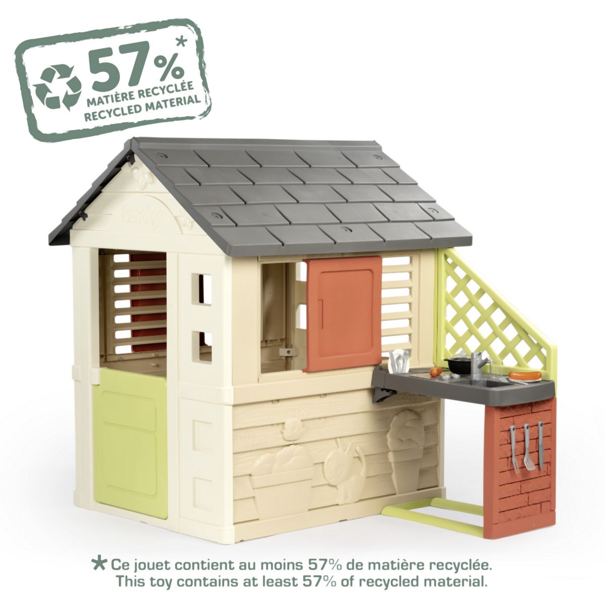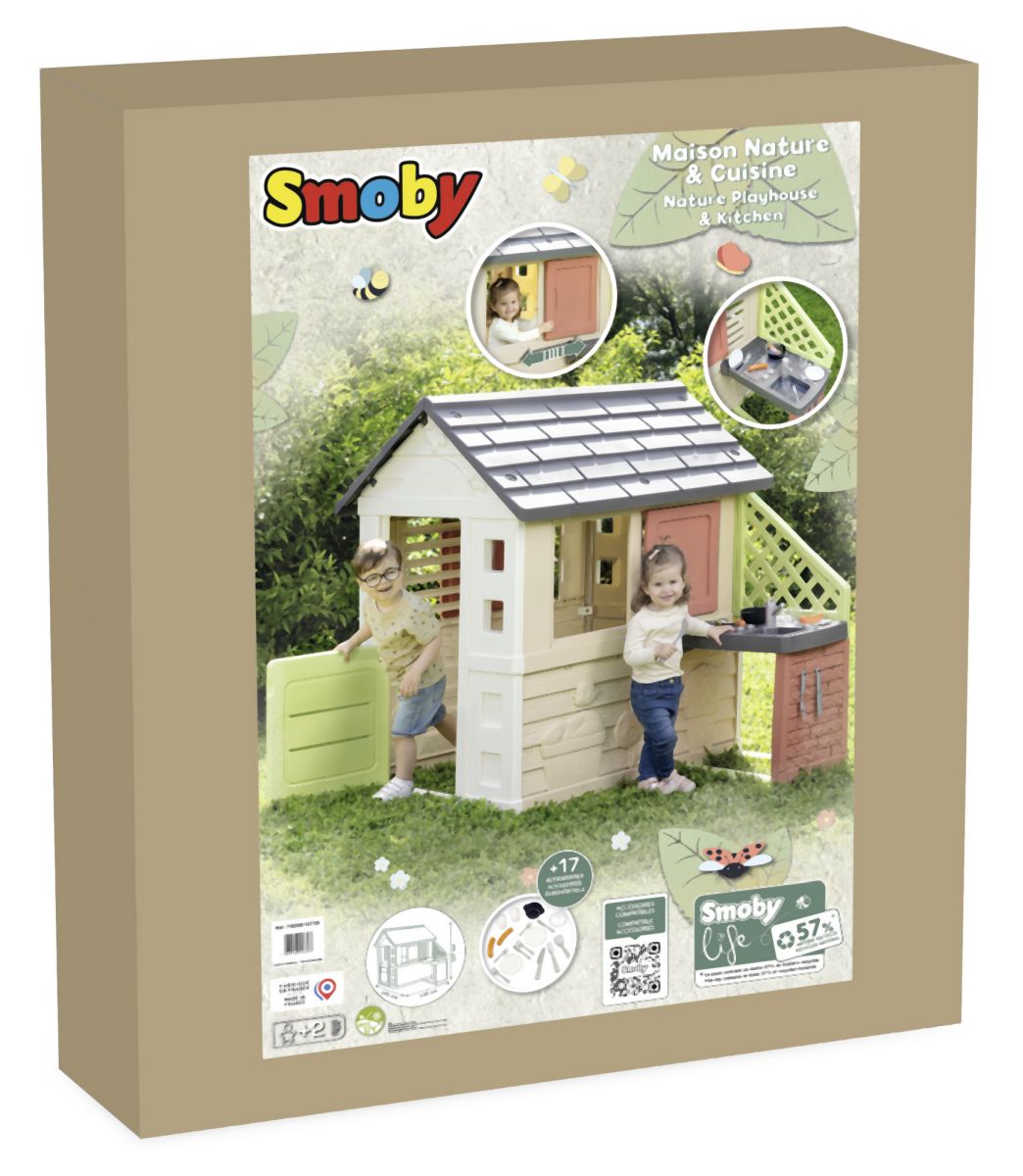 Stabilní, prostorný domeček Smoby Life Nature se skvělou letní kuchyňkou nabízí spoustu zábavy pro nejmenší. Kuchyňka je připevněna ke vnější stěně, má dřez s kohoutkem (nefunkční), grilovací desku na vaření a grilování a polici na nádobí. Zážitek z vaření doplňují 2 sklenice, 2 talíře, různé kuchyňské náčiní, klobásy a malý rendlík. Snadná montáž. Módní barevné provedení dodává zahradnímu domku svěží a moderní vzhled. Čtyři robustní boční stěny jsou navrženy velmi detailně, motýli a malá kočka zdobí fasádu a vytvářejí zábavný design. Vybavení domu doplňují 2 okna s lamelami, 2 posuvná okna s možností otevírání a zavírání a malé vstupní dveře. Domeček je vyroben z vysoce kvalitního plastu odolného vůči UV záření a je zvláště odolný vůči povětrnostním vlivům a vyblednutí. Tento výrobek obsahuje minimálně 57 % recyklovaného materiálu. Rozměry produktu (DxŠxV): 145 x 110 x 127 cm.