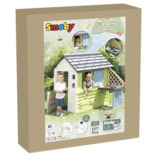 Stabilní, prostorný domeček Smoby Life Pretty se skvělou letní kuchyňkou nabízí spoustu zábavy pro nejmenší. Kuchyňka je připevněna ke vnější stěně, má dřez s kohoutkem (nefunkční), grilovací desku na vaření a grilování a polici na nádobí. Zážitek z vaření doplňují 2 sklenice, 2 talíře, různé kuchyňské náčiní, klobásy a malý rendlík. Snadná montáž. Módní barevné provedení v tyrkysové a zelené dodává zahradnímu domku svěží a moderní vzhled. Čtyři robustní boční stěny jsou navrženy velmi detailně, motýli a malá kočka zdobí fasádu a vytvářejí zábavný design. Vybavení domu doplňují 2 okna s lamelami, 2 posuvná okna s možností otevírání a zavírání a malé vstupní dveře. Domeček je vyroben z vysoce kvalitního plastu odolného vůči UV záření a je zvláště odolný vůči povětrnostním vlivům a vyblednutí. Tento výrobek obsahuje minimálně 57 % recyklovaného materiálu. Rozměry produktu (DxŠxV): 145 x 110 x 127 cm.
