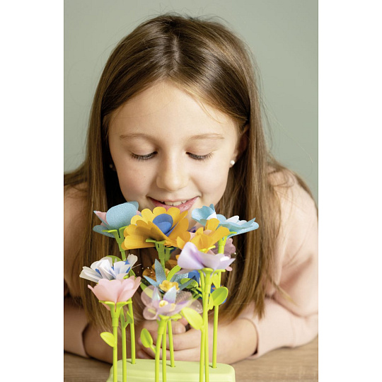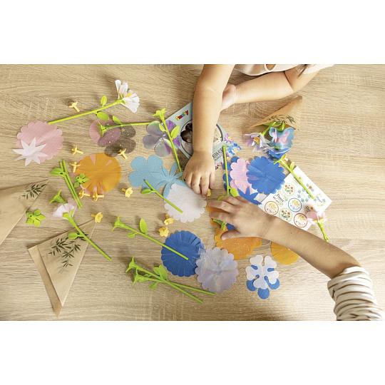 Kreativní sada obsahuje stroj na výrobu květin. Dále mnoho doplňků, např. stonky, květiny, razítka, vázy, papírové tašky, samolepky. Z krabice lze vystříhnout šablony pro další květiny, možno použít i staré látky a tvořit dle fantazie. Lze používat opakovaně, sestavením květin nevznikají nikde žádné dírky. Rozměry rozbaleného výrobku: 44,50 x 37,30 x 24,50 cm.