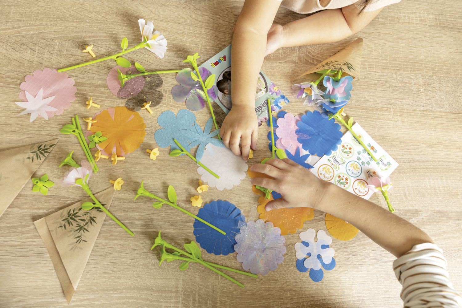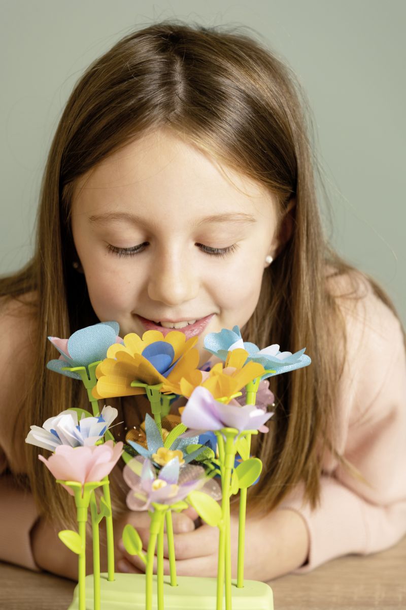 Kreativní sada obsahuje stroj na výrobu květin. Dále mnoho doplňků, např. stonky, květiny, razítka, vázy, papírové tašky, samolepky. Z krabice lze vystříhnout šablony pro další květiny, možno použít i staré látky a tvořit dle fantazie. Lze používat opakovaně, sestavením květin nevznikají nikde žádné dírky. Rozměry rozbaleného výrobku: 44,50 x 37,30 x 24,50 cm.