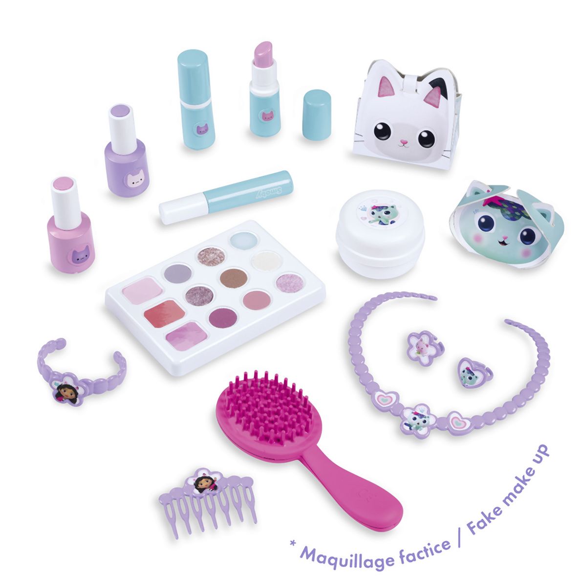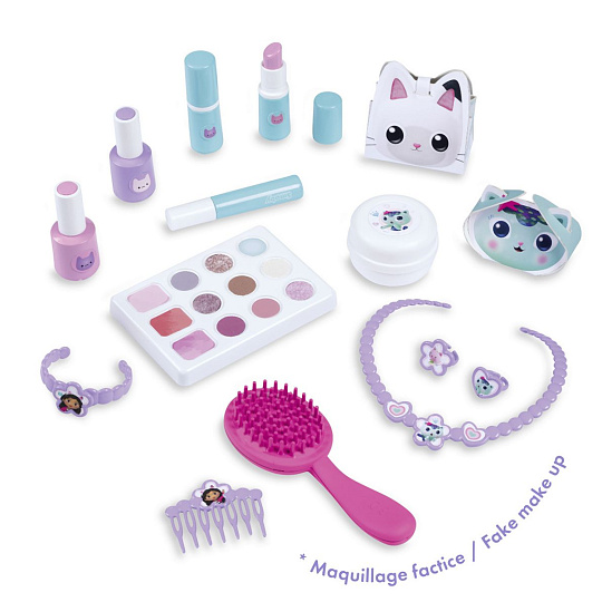 Kosmetický kufřík v designu Gabby´s Dollhouse je naplněn vším, co je potřeba pro skvělé mobilní wellness, ať už jde o účes, nehtový salon nebo make-up. Všech 15 doplňků (atrapy kosmetiky ke hraní) najdete uvnitř kufříku s rukojetí, který lze vzít kamkoli: 2 laky na nehty, 2 rtěnky, paleta očních stínů, řasenka, štětec, spona, hřeben, náhrdelník, náramek, 2 prsteny, nádobka na krém a 2 krabičky. Díky možnosti zamčení se na cestě z kufříku nic neztratí. Navíc má zrcadlo a tajnou přihrádku. Police uvnitř lze sklopit, pro vytvoření prostoru pro další kosmetiku. Rozměry produktu (DxŠxV): 35,5 x 28,6 x 28,5 cm.