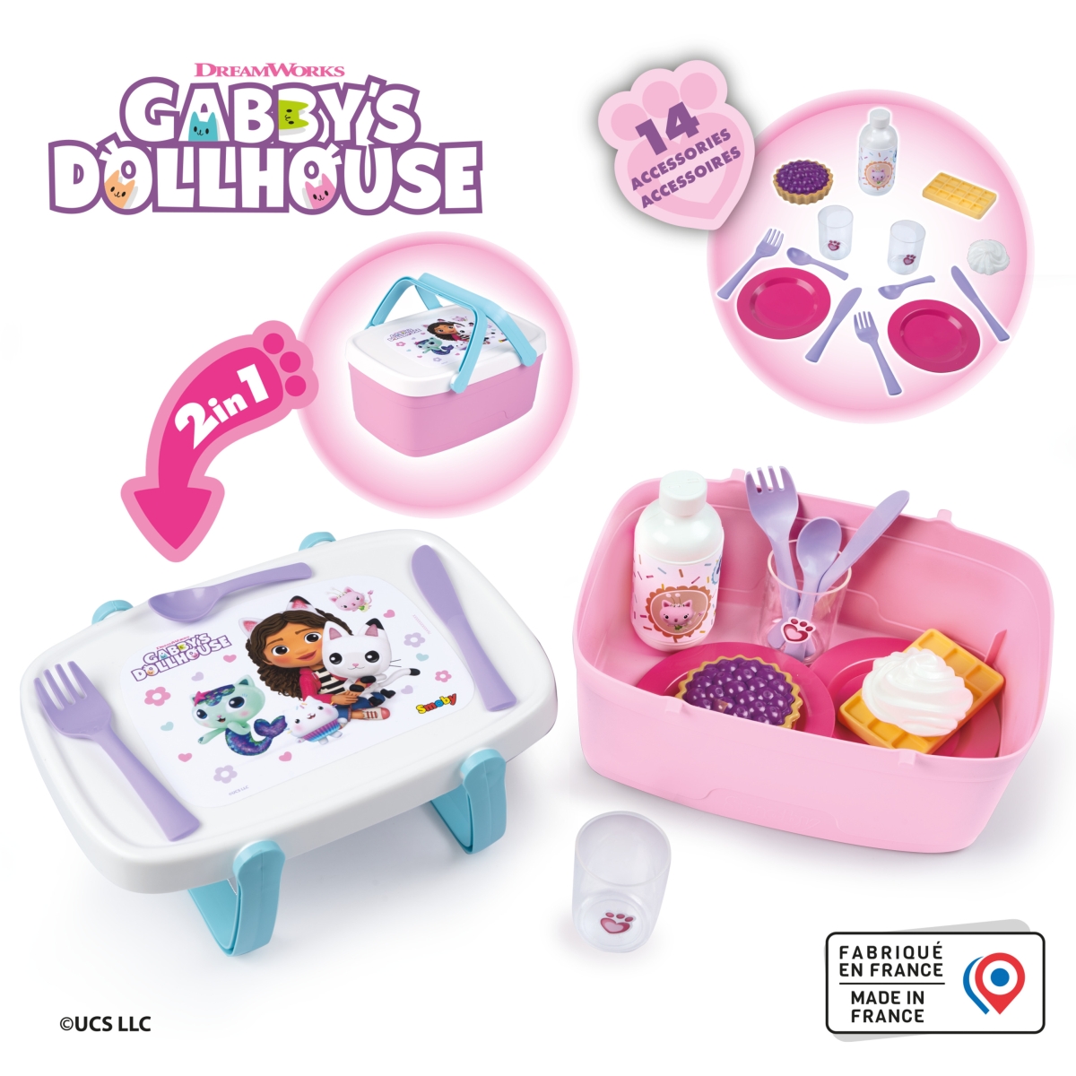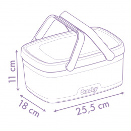 Piknikový koš 2 v 1 s motivem Gabby´s Dollhouse lze snadno přeměnit na stoleček - sklopením rukojetí u víka. Součástí je 14 ks příslušenství: 2 talířky, 2 lžičky, 2 nože, 2 vidličky, 2 skleničky, 1vafle, šlehačka, borůvkový koláč, láhev limonády. Rozměry (DxŠxV): 25,5 x 18 x 11 cm.