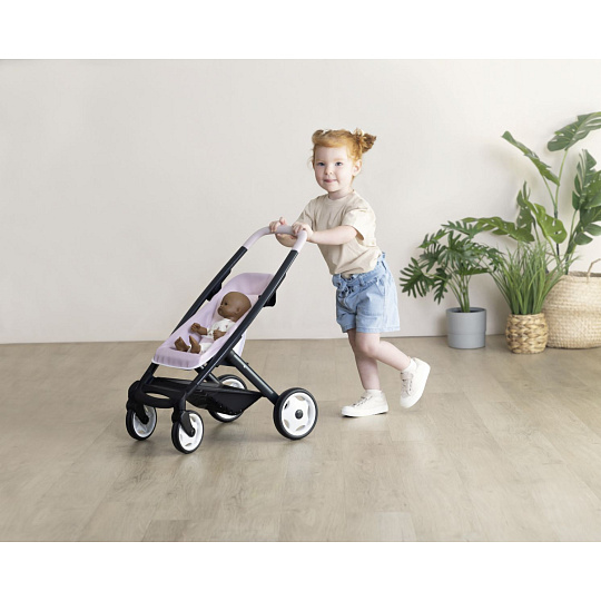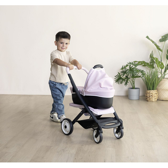 Kombinovaný kočárek pro panenky do velikosti 42 cm. S odnímatelným košíkem. Nasazením korbičky získáte kočárek hluboký nebo lze používat jen jako sportovní kočárek. Korbičku lze použít také samostatně. Výška k ergonomické rukojeti je 64 cm. Přední kolečka otočná, kolečka s protihlukovou vrstvou. Průměr koleček: 15,5 cm a 12,5 cm.
