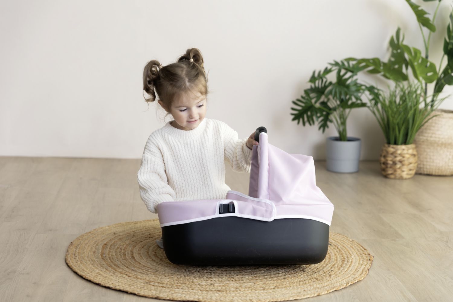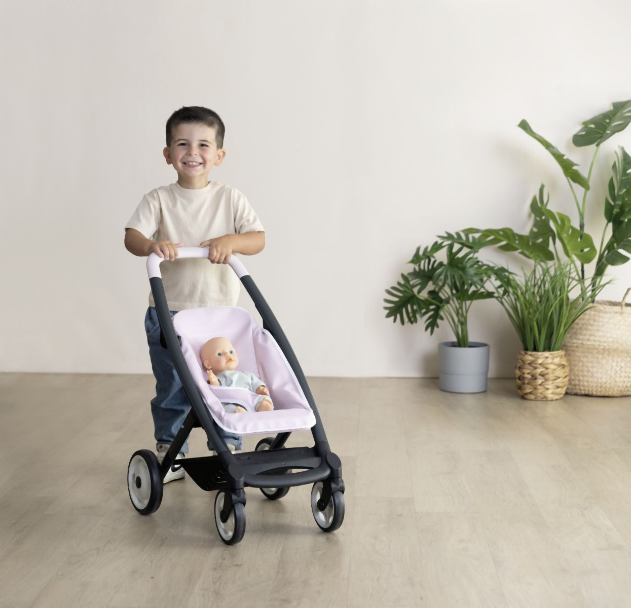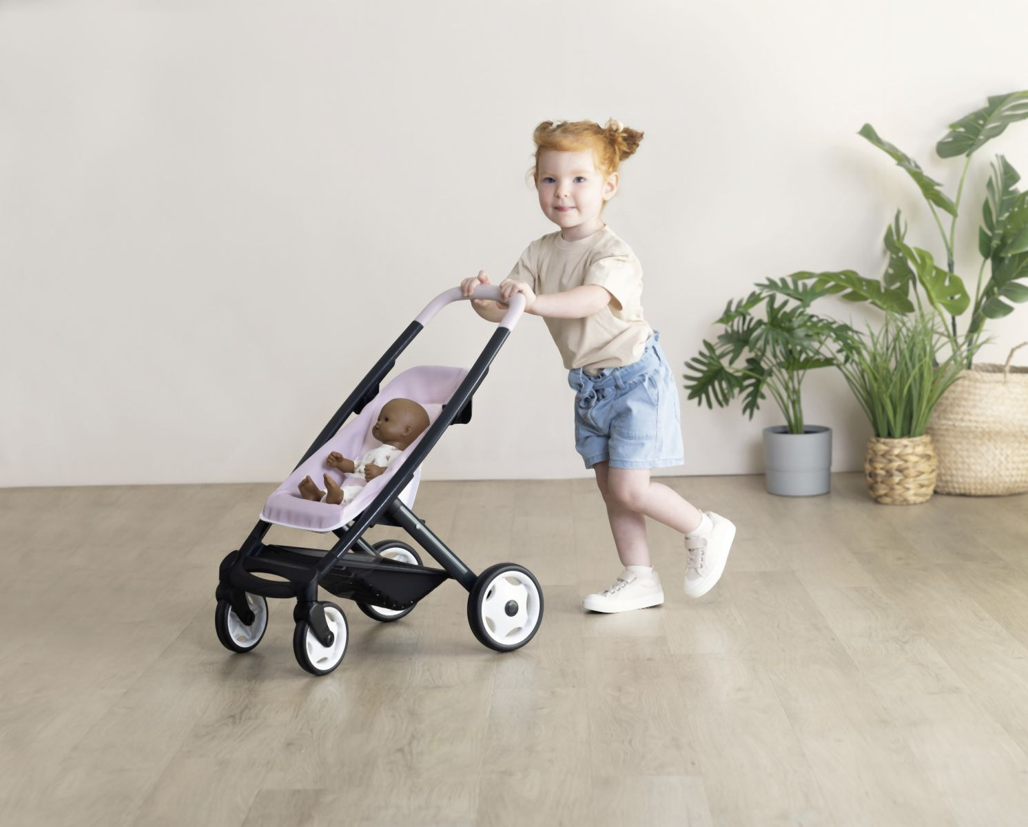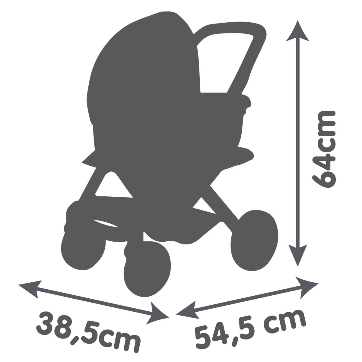 Kombinovaný kočárek pro panenky do velikosti 42 cm. S odnímatelným košíkem. Nasazením korbičky získáte kočárek hluboký nebo lze používat jen jako sportovní kočárek. Korbičku lze použít také samostatně. Výška k ergonomické rukojeti je 64 cm. Přední kolečka otočná, kolečka s protihlukovou vrstvou. Průměr koleček: 15,5 cm a 12,5 cm.