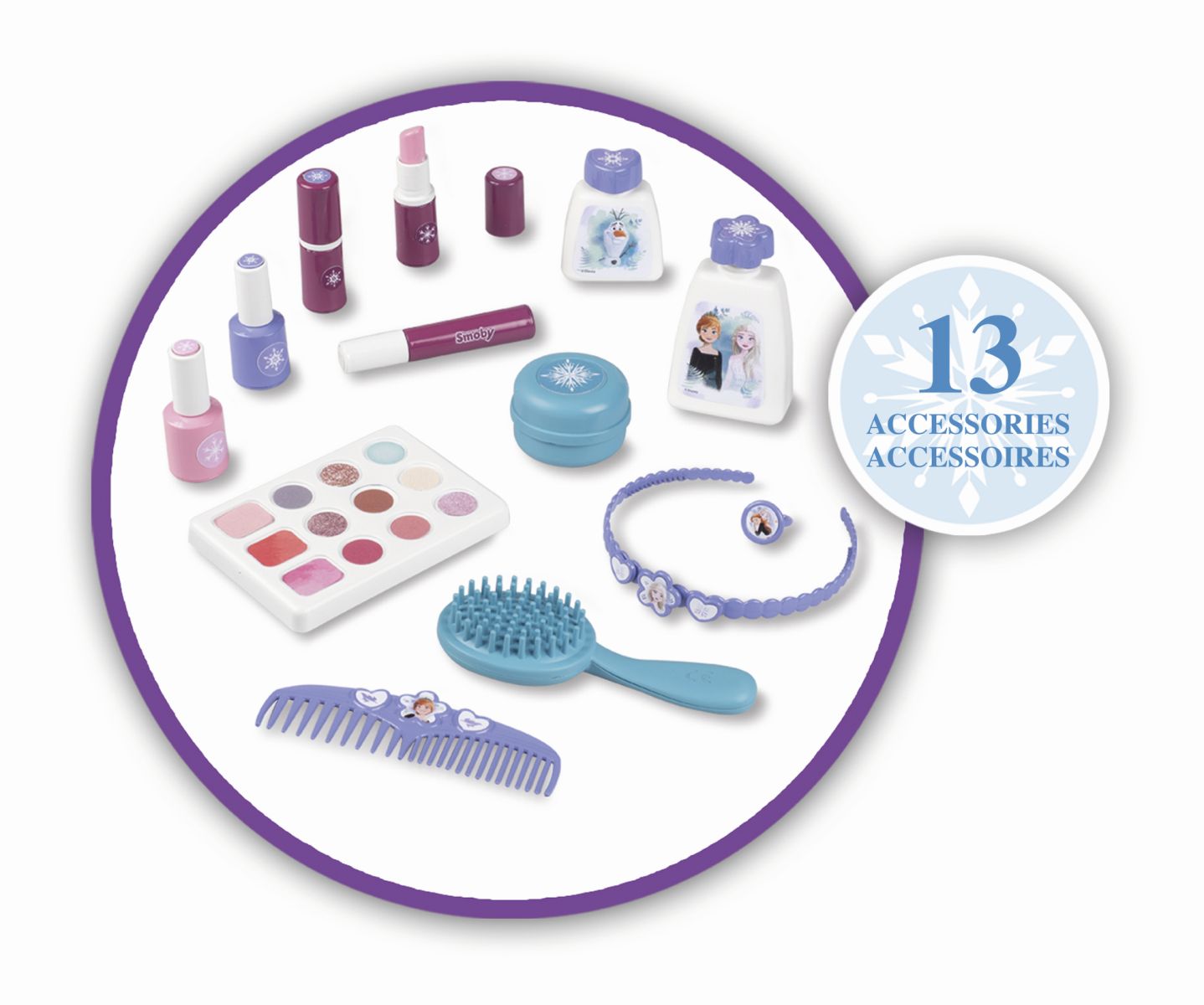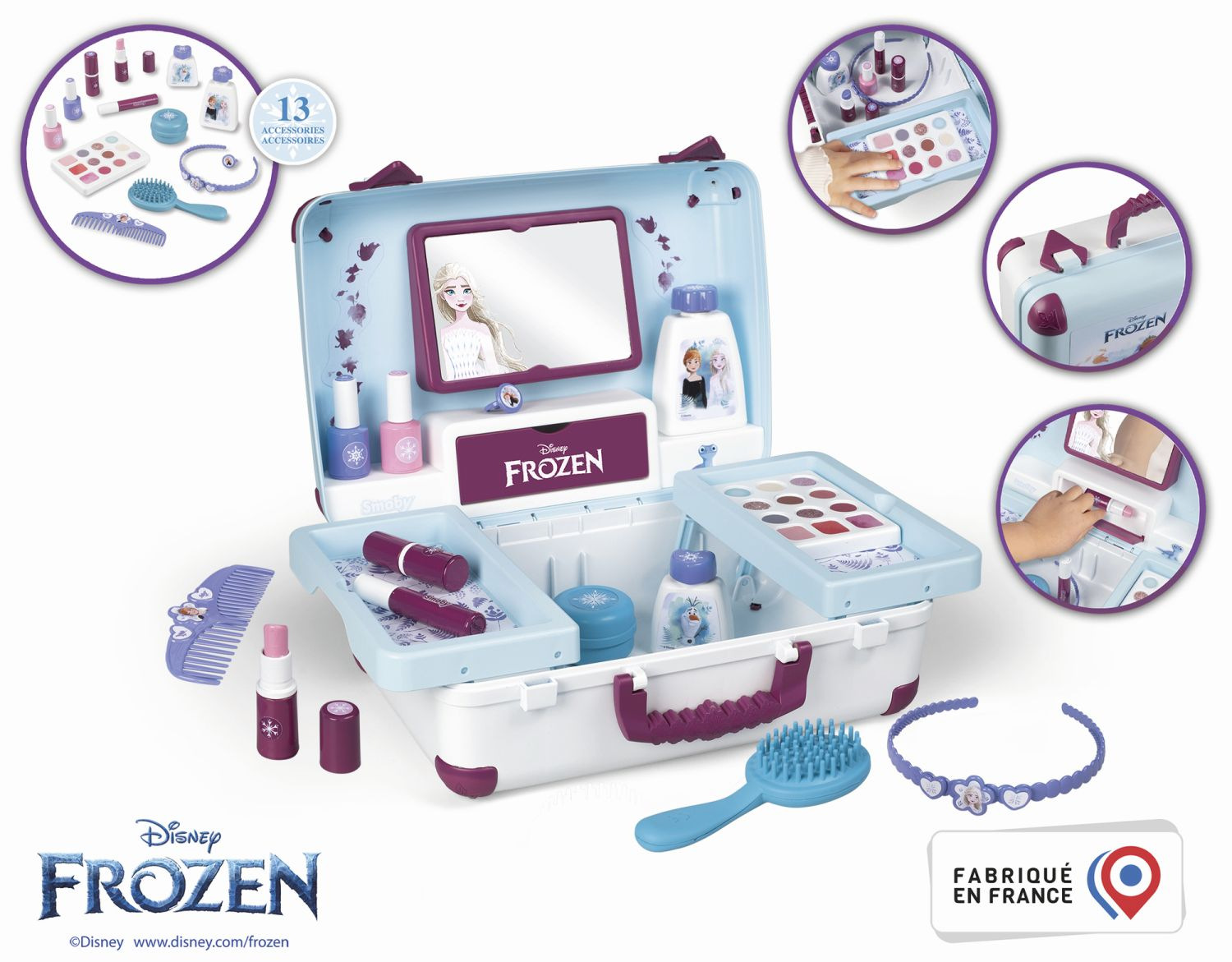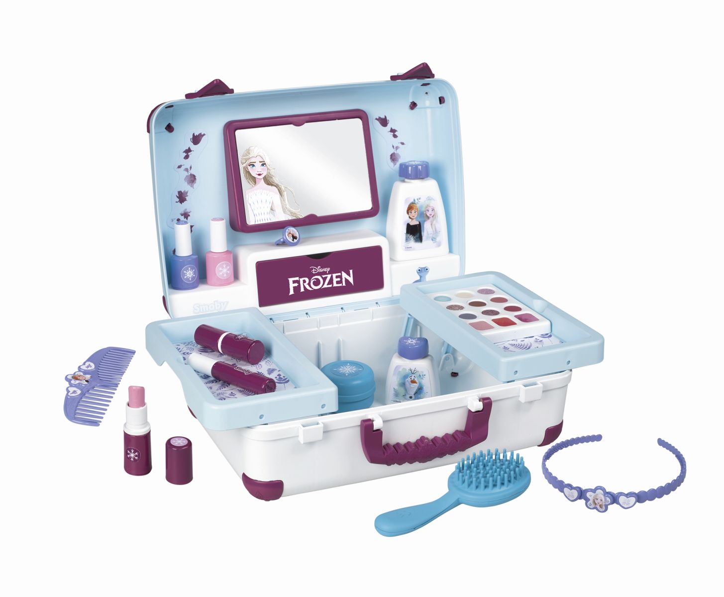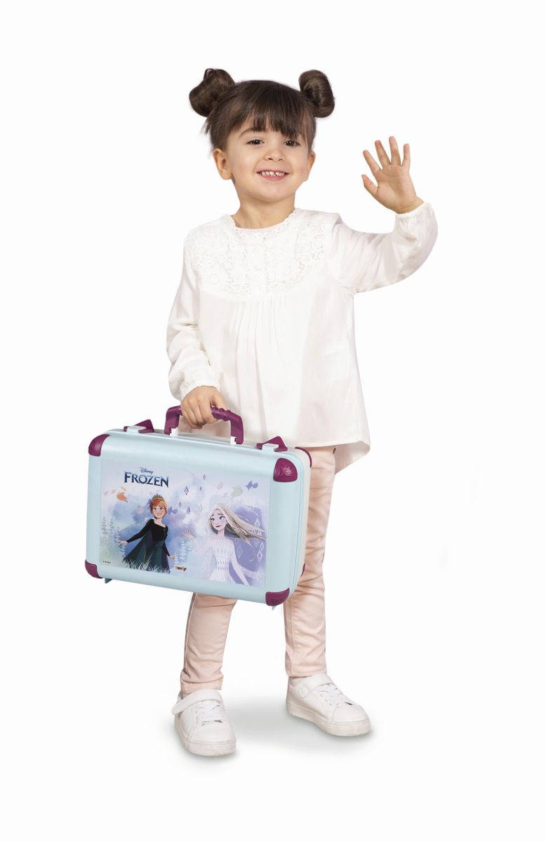 Kosmetický kufřík v designu Ledového království je naplněn vším, co je potřeba pro skvělé mobilní wellness, ať už jde o účes, nehtový salon nebo make-up. Všech 13 doplňků (atrapy kosmetiky ke hraní) najdete uvnitř kufříku s rukojetí, který lze vzít kamkoli: 2 laky na nehty, 2 rtěnky, paleta očních stínů, řasenka, štětec, hřeben, čelenka, prsten a různé lahvičky. Díky možnosti zamčení se na cestě z kufříku nic neztratí. Navíc má zrcadlo a tajnou přihrádku. Police uvnitř lze sklopit, pro vytvoření prostoru pro další kosmetiku. Rozměry produktu (DxŠxV): 35,5 x 28,6 x 28,5 cm.