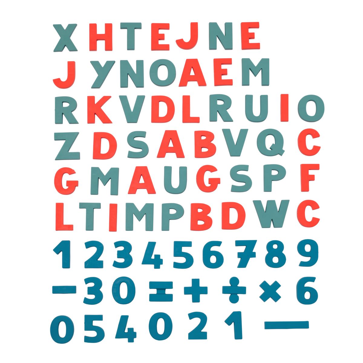 72 magnetických velkých písmen, čísel a symbolů ve 3 barvách. Pomáhá tvořit slova a učit se počítat.