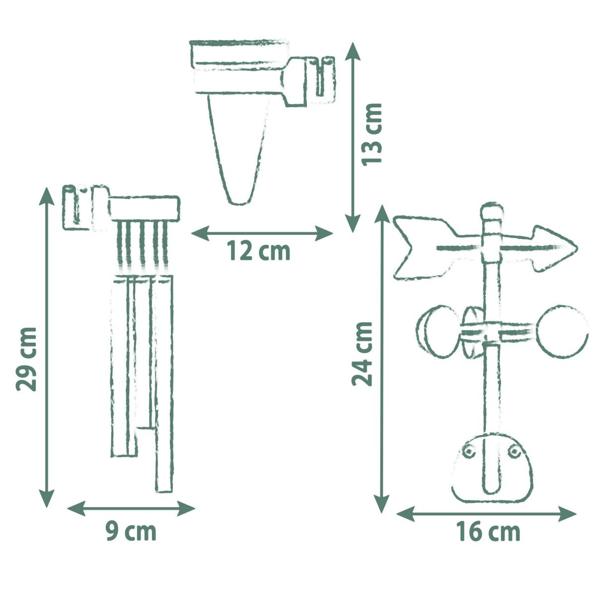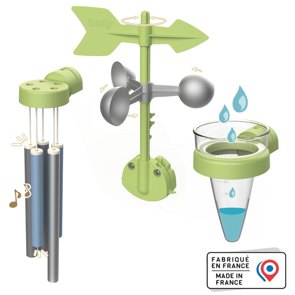 Hrací sada meteorologická stanice ke zkoumání počasí: zvonkohra, větrná korouhvička/anemometr a srážkoměr. Sada je kompatibilní se všemi domečky Smoby. S touto sadou mohou děti objevovat a pozorovat jevy počasí. Lze snadno připevnit. Sada je vyrobena z vysoce kvalitního plastu odolnému vůči UV záření a je zvláště odolná vůči povětrnostním vlivům a vyblednutí.