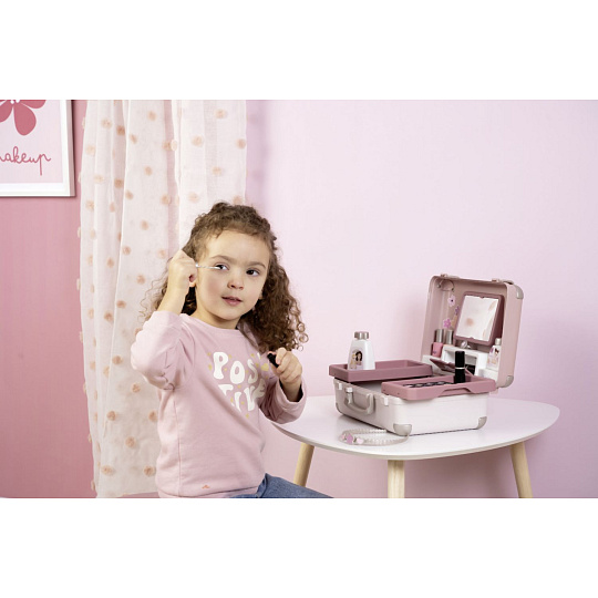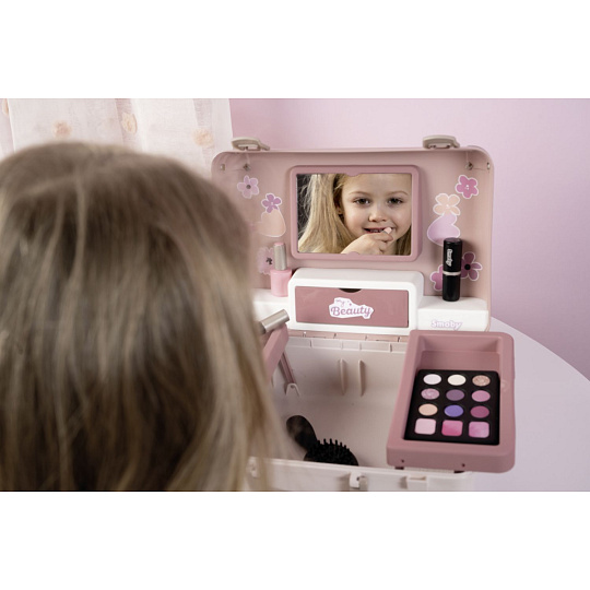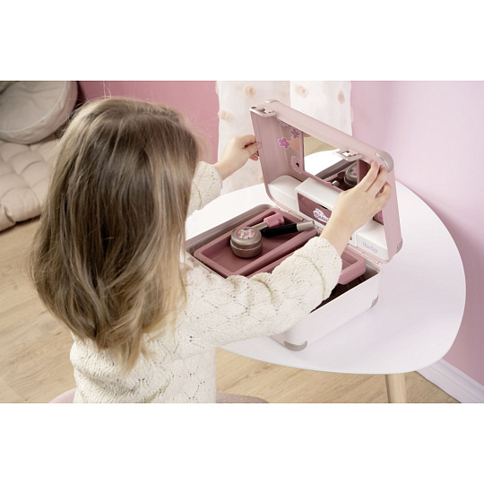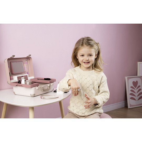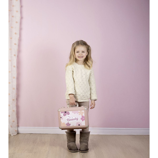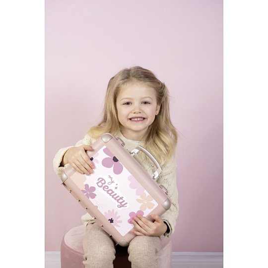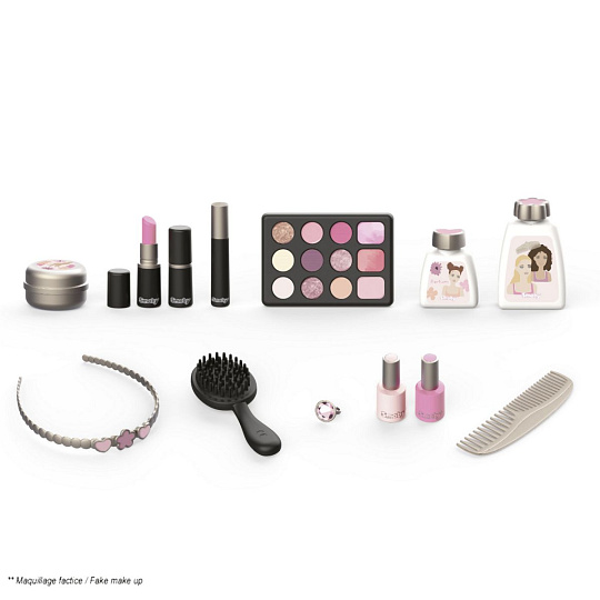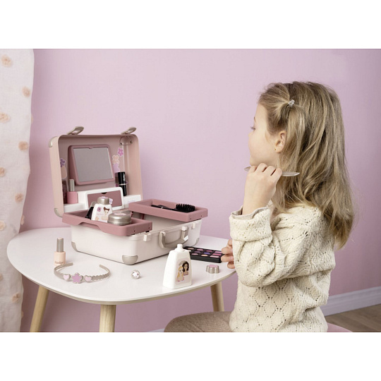 Kosmetický kufřík My Beauty je naplněn vším, co je potřeba pro skvělé mobilní wellness, ať už jde o účes, nehtový salon nebo make-up. Všech 13 doplňků (atrapy kosmetiky ke hraní) najdete uvnitř kufříku s rukojetí, který lze vzít kamkoli: 2 laky na nehty, 2 rtěnky, paleta očních stínů, řasenka, hřeben, čelenka, prsten a různé lahvičky. Díky možnosti zamčení se na cestě z kufříku nic neztratí. Navíc má zrcadlo a tajnou přihrádku. Police uvnitř lze sklopit, pro vytvoření prostoru pro další kosmetiku. Rozměry produktu (DxŠxV): 28 x 35 x 28 cm.
