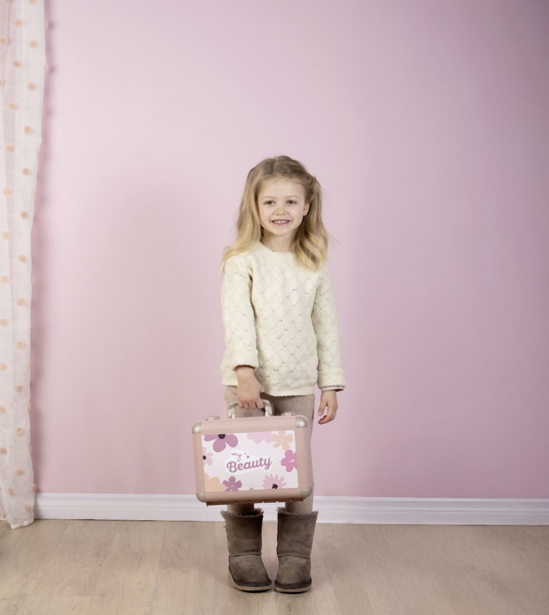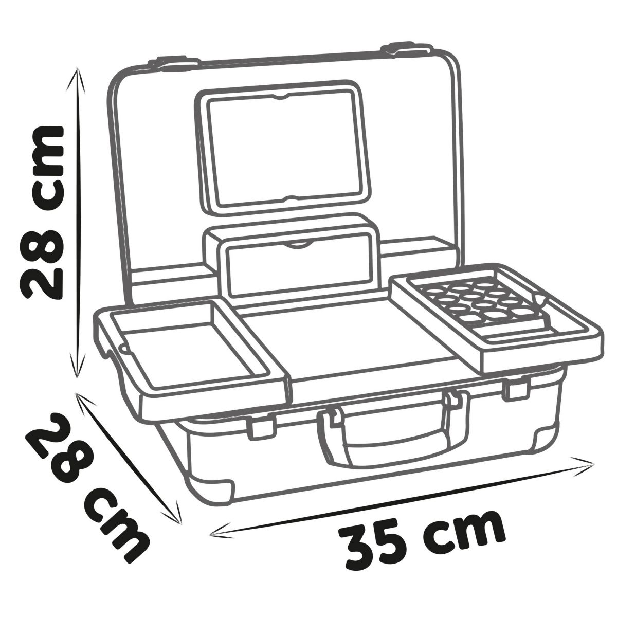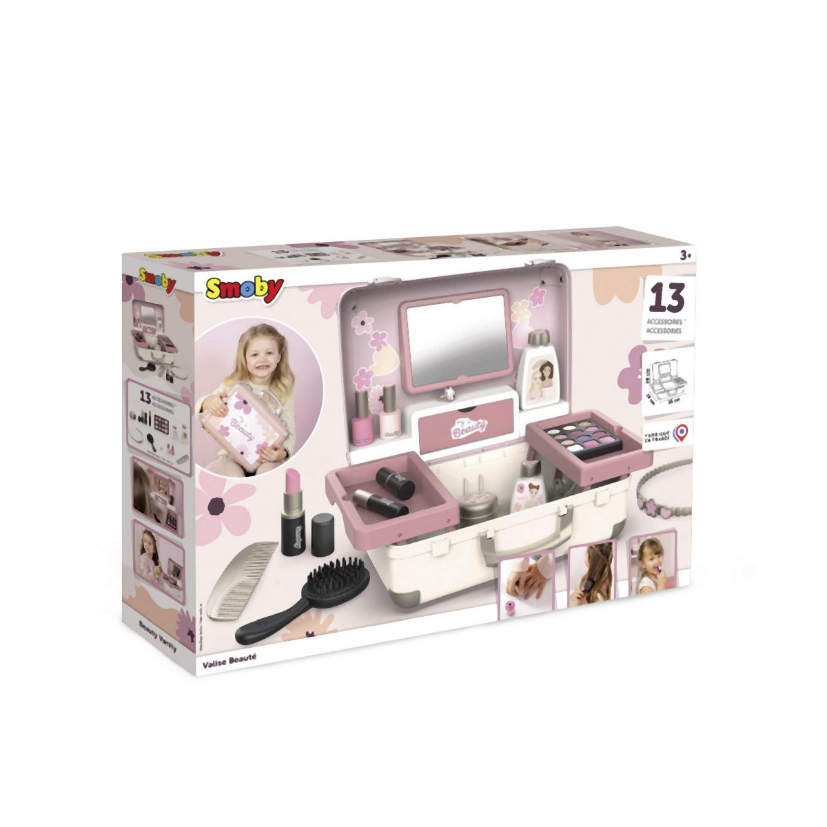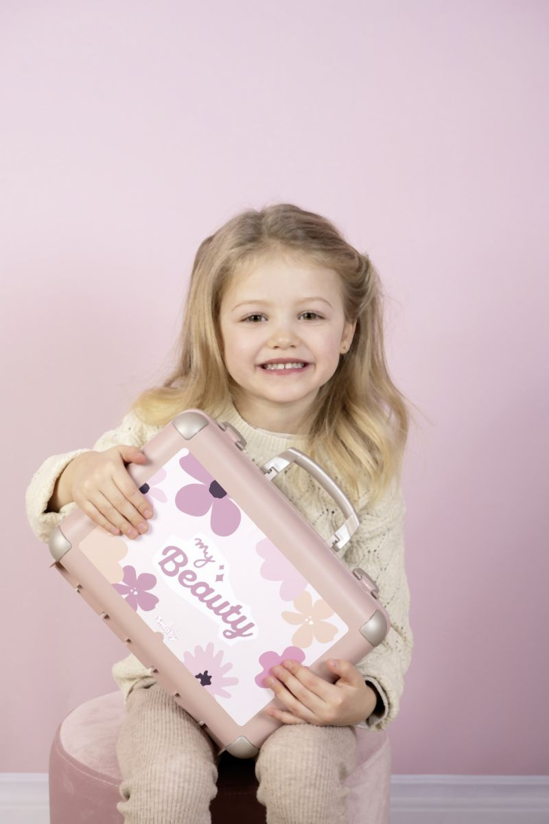 Kosmetický kufřík My Beauty je naplněn vším, co je potřeba pro skvělé mobilní wellness, ať už jde o účes, nehtový salon nebo make-up. Všech 13 doplňků (atrapy kosmetiky ke hraní) najdete uvnitř kufříku s rukojetí, který lze vzít kamkoli: 2 laky na nehty, 2 rtěnky, paleta očních stínů, řasenka, hřeben, čelenka, prsten a různé lahvičky. Díky možnosti zamčení se na cestě z kufříku nic neztratí. Navíc má zrcadlo a tajnou přihrádku. Police uvnitř lze sklopit, pro vytvoření prostoru pro další kosmetiku. Rozměry produktu (DxŠxV): 28 x 35 x 28 cm.