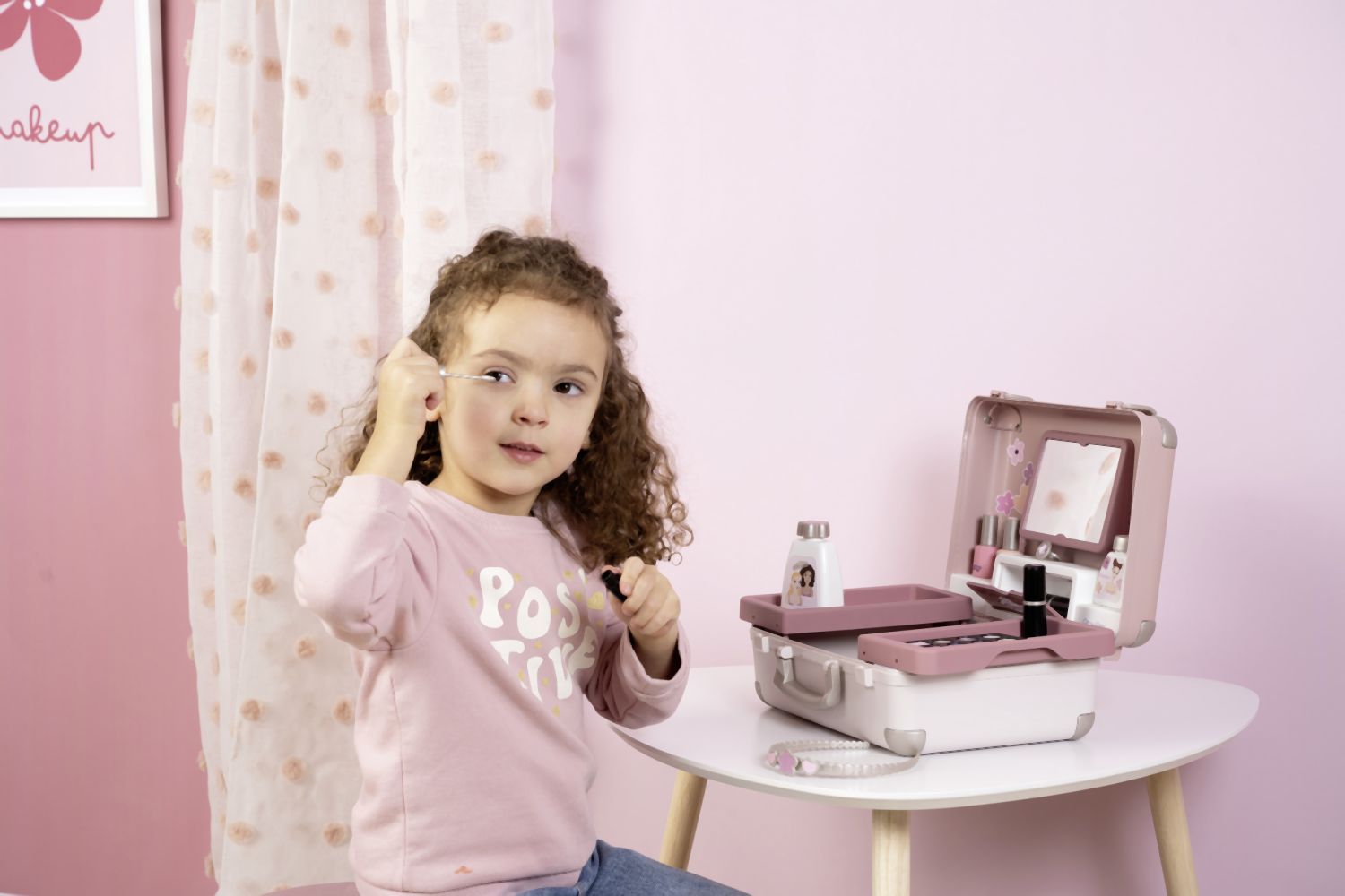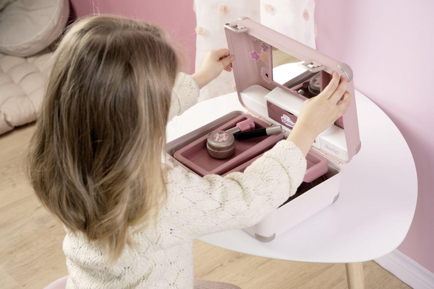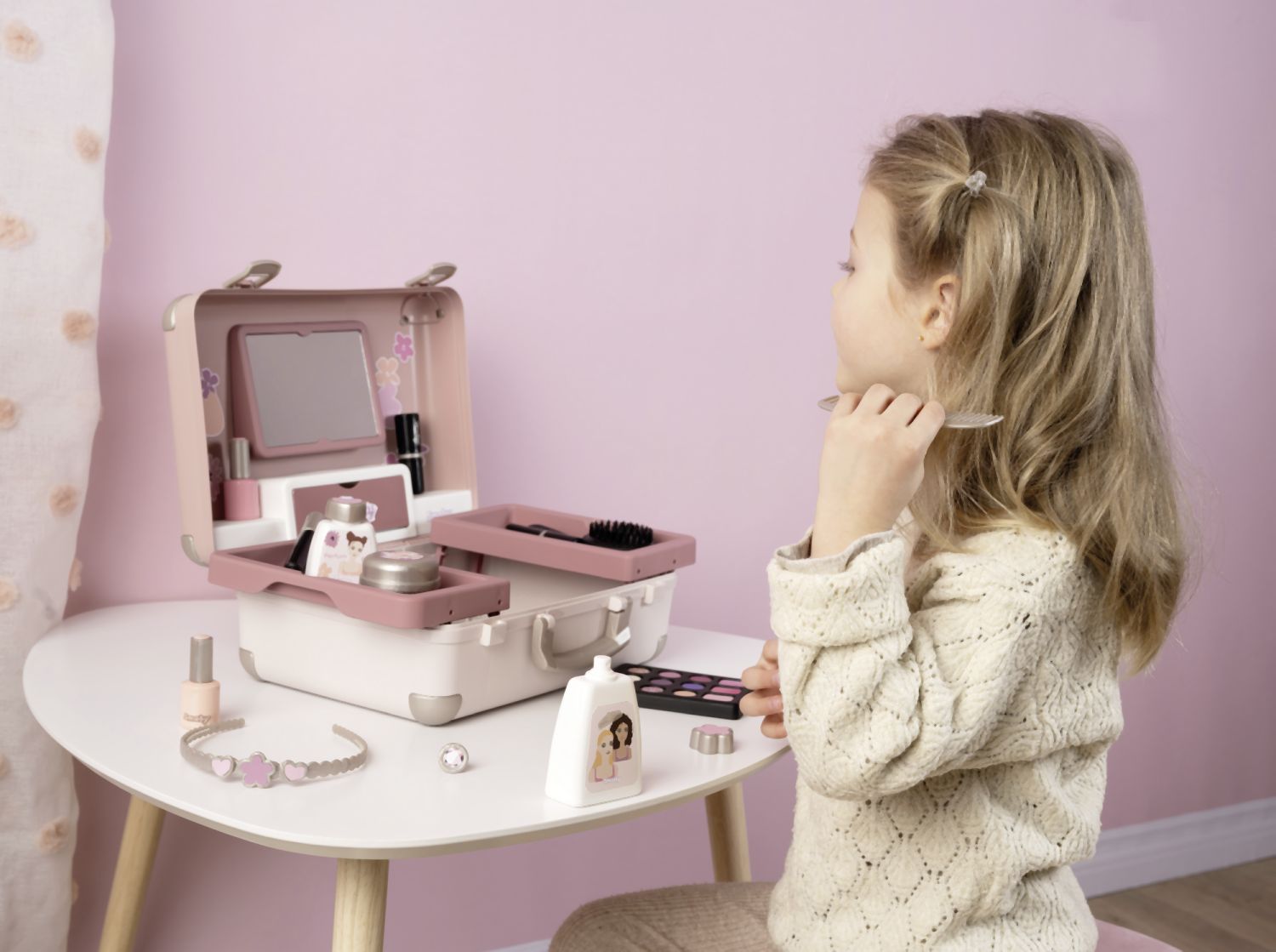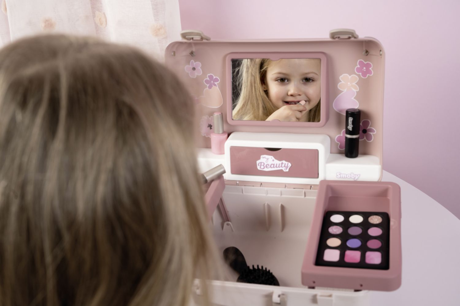 Kosmetický kufřík My Beauty je naplněn vším, co je potřeba pro skvělé mobilní wellness, ať už jde o účes, nehtový salon nebo make-up. Všech 13 doplňků (atrapy kosmetiky ke hraní) najdete uvnitř kufříku s rukojetí, který lze vzít kamkoli: 2 laky na nehty, 2 rtěnky, paleta očních stínů, řasenka, hřeben, čelenka, prsten a různé lahvičky. Díky možnosti zamčení se na cestě z kufříku nic neztratí. Navíc má zrcadlo a tajnou přihrádku. Police uvnitř lze sklopit, pro vytvoření prostoru pro další kosmetiku. Rozměry produktu (DxŠxV): 28 x 35 x 28 cm.