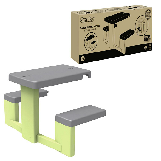 Piknikový stoleček s 2 lavicemi pro děti jako doplněk pro domeček Neo Jura Lodge, My New House, Chef House a Evo Friends House. Anti-UV ošetření zaručuje dobrou odolnost a trvanlivost barev. Výška stolečku 49 cm. Délka lavice 81 cm. Max. nosnost každé lavice 50 kg. Rozměry (DxŠxV): 81 x 54 x 49 cm. Barva zelená a šedá. Tento výrobek obsahuje minimálně 53 % recyklovaného materiálu.