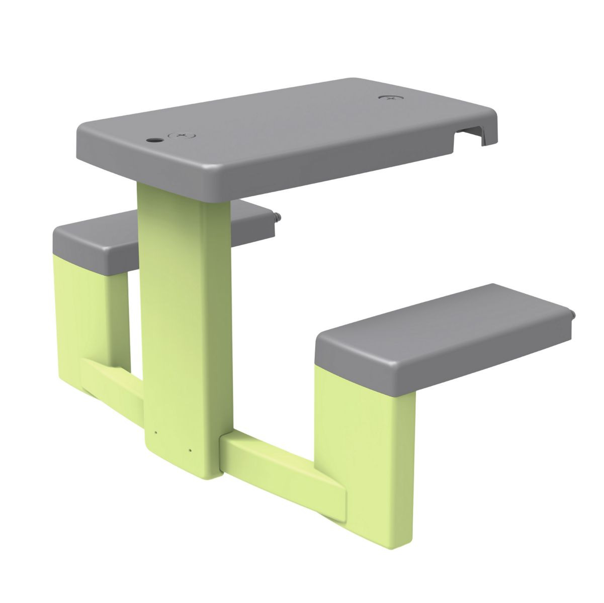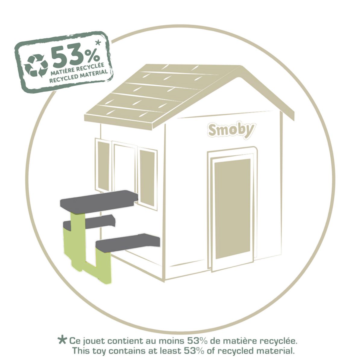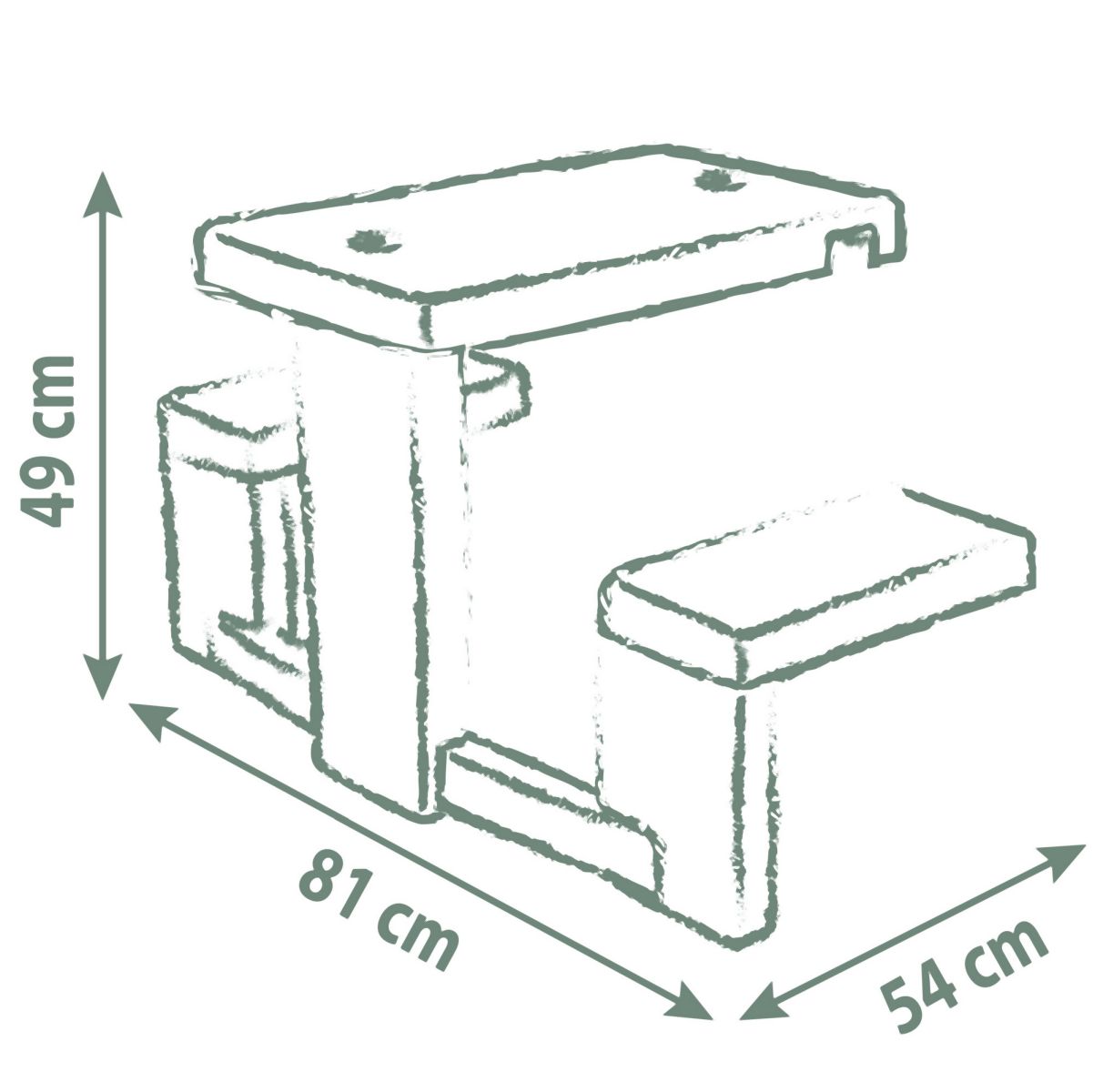 Piknikový stoleček s 2 lavicemi pro děti jako doplněk pro domeček Neo Jura Lodge, My New House, Chef House a Evo Friends House. Anti-UV ošetření zaručuje dobrou odolnost a trvanlivost barev. Výška stolečku 49 cm. Délka lavice 81 cm. Max. nosnost každé lavice 50 kg. Rozměry (DxŠxV): 81 x 54 x 49 cm. Barva zelená a šedá. Tento výrobek obsahuje minimálně 53 % recyklovaného materiálu.