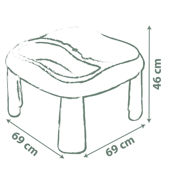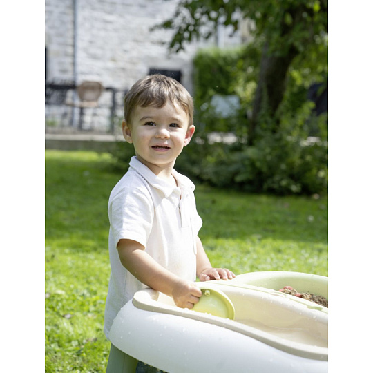 Venkovní stoleček z kvalitního, robustního plastu. Součástí stolu jsou dva vyjímatelné boxy na písek a vodu, lodička, hrabičky, lopatička a 2 formičky na písek. Dodáváno i s ochranným víkem (2 části). Vhodný i do prostor s nedostatkem místa.Uprostřed stolu otvor pro slunečník (není součástí balení). Plastové díly jsou ošetřeny anti-UV, což zajišťuje dobrou odolnost a stálost barev v průběhu času. Tento výrobek obsahuje minimálně 83% recyklovaného materiálu. Rozměry: 69 x 46 x 69 cm. Hmotnost cca 4,5 kg.