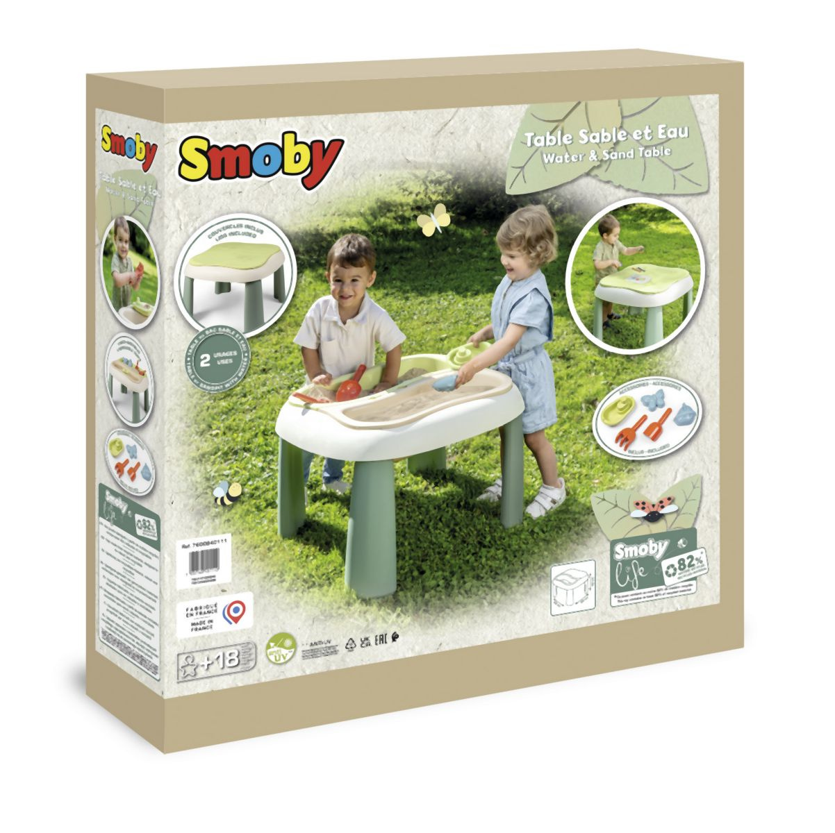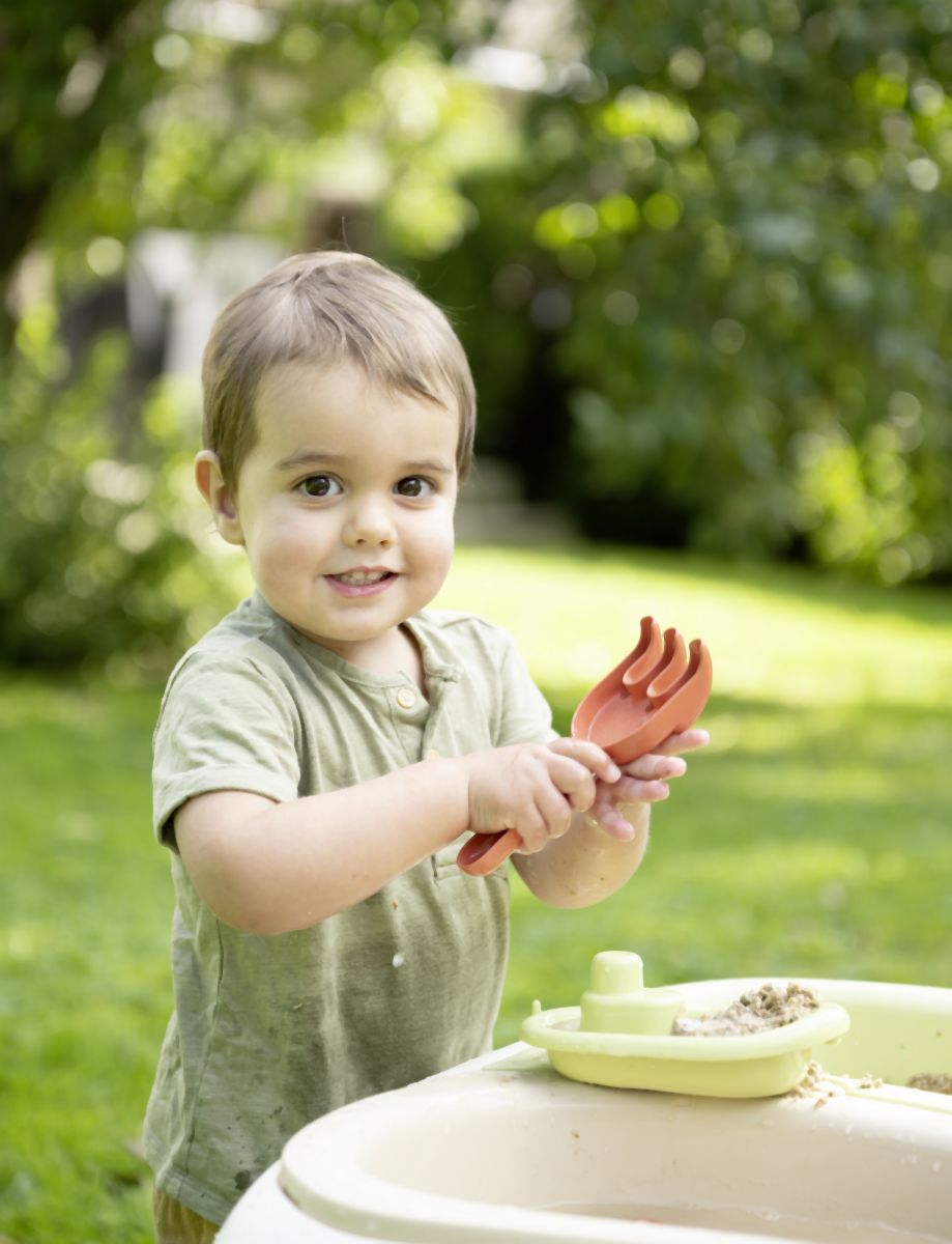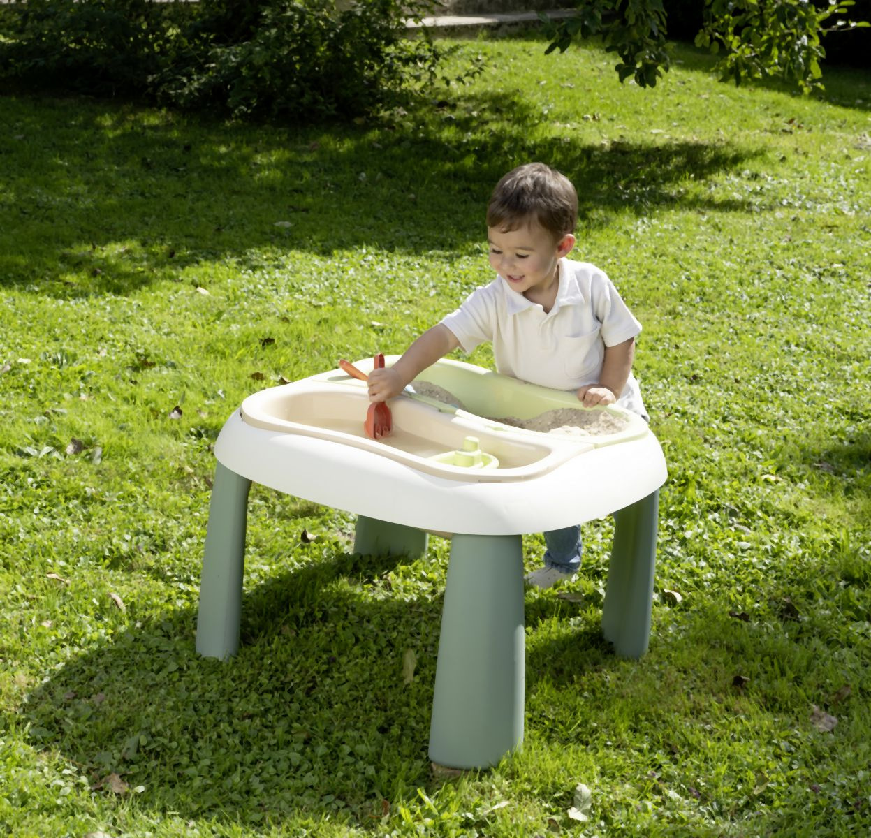 Venkovní stoleček z kvalitního, robustního plastu. Součástí stolu jsou dva vyjímatelné boxy na písek a vodu, lodička, hrabičky, lopatička a 2 formičky na písek. Dodáváno i s ochranným víkem (2 části). Vhodný i do prostor s nedostatkem místa.Uprostřed stolu otvor pro slunečník (není součástí balení). Plastové díly jsou ošetřeny anti-UV, což zajišťuje dobrou odolnost a stálost barev v průběhu času. Tento výrobek obsahuje minimálně 83% recyklovaného materiálu. Rozměry: 69 x 46 x 69 cm. Hmotnost cca 4,5 kg.