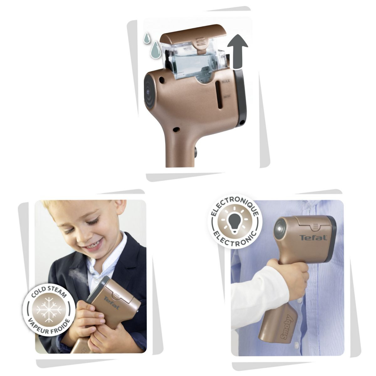 Ruční napařovací žehlička pro malé hospodyňky je jako opravdová, inspirovaná napařovačem oděvů Tefal Pure POP. S funkcí skutečné páry po stisknutí tlačítka. 3 barevné kombinace (bílá, černá, bronzová). Rozměry žehličky (DxŠxV): 3,5 x 8 x 18 cm.
