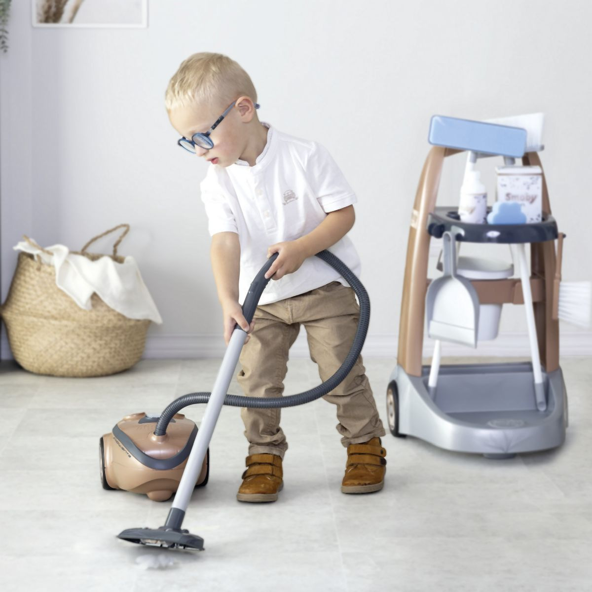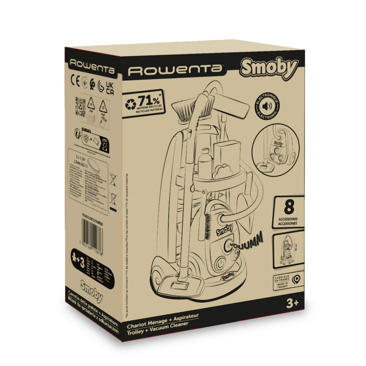 Úklidový vozík s vysavačem Rowenta s příslušenstvím. Dětský vysavač vydává skutečný zvuk vysavače. Díky kompaktní velikosti a nízké hmotnosti je snadno ovladatelný i pro menší děti od 3 let. Další příslušenství k úklidovému vozíku: lopatka a smeták, mop a makety obalů od čisticích prostředků atd. Tento výrobek obsahuje minimálně 71 % recyklovaného materiálu. Rozměry produktu (DxŠxV): 31 x 32 x 55 cm.