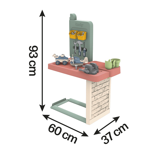 Dílna pro kutily jako doplněk k domečkům Smoby Life. Dílna se připevňuje k vnější stěně domečku, dílenský stůl má velkou pracovní plochu a stěnu s boxy pro uložení příslušenství. Součástí balení je 39 doplňků pro rozšíření herních možností: 1 šroubovák, 1 kladivo, 1 otevřený klíč, 1 svěrák, spojovací materiál, 2 vozidla (auto a vrtulník) k sestavení. Pracovní deska má otvory pro trénování zatloukání hřebíků. Dílna je vyrobena z vysoce kvalitního plastu odolného vůči UV záření a je zvláště odolný vůči povětrnostním vlivům a vyblednutí. Tento výrobek obsahuje minimálně 70 % recyklovaného materiálu. Rozměry produktu (DxŠxV): 60 x 37 x 93 cm. Vyroben ve Francii. Vhodné pro děti od 2 let.