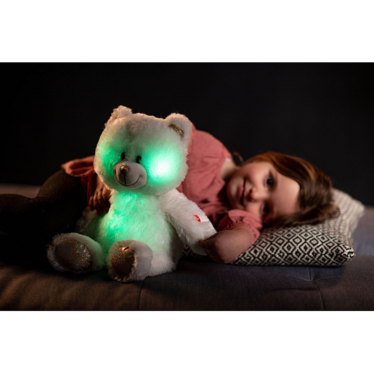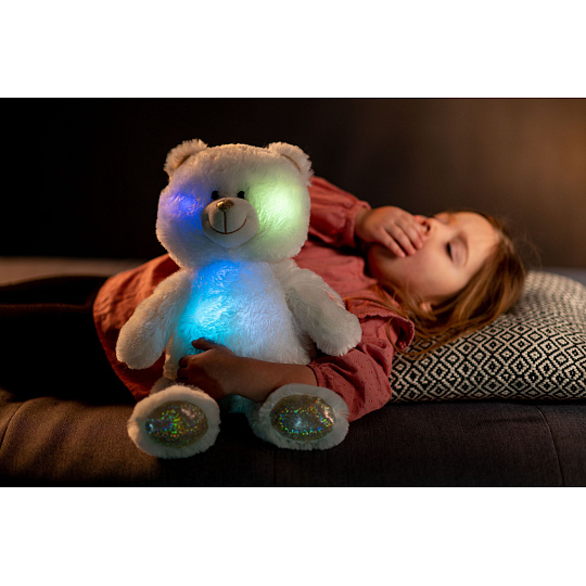 Roztomilý plyšový medvídek je vyroben z kvalitní jemné plyše. Tento plyšový kousek je ideálním dárkem! Medvídek Snílek pomáhá dětem snadněji usnout. Po zmáčknutí tlapky hraje klidnou relaxační hudbu. Ve tmě svítí a mění barvy. Velikost medvěda: 40 cm Vhodné pro děti od 3 let