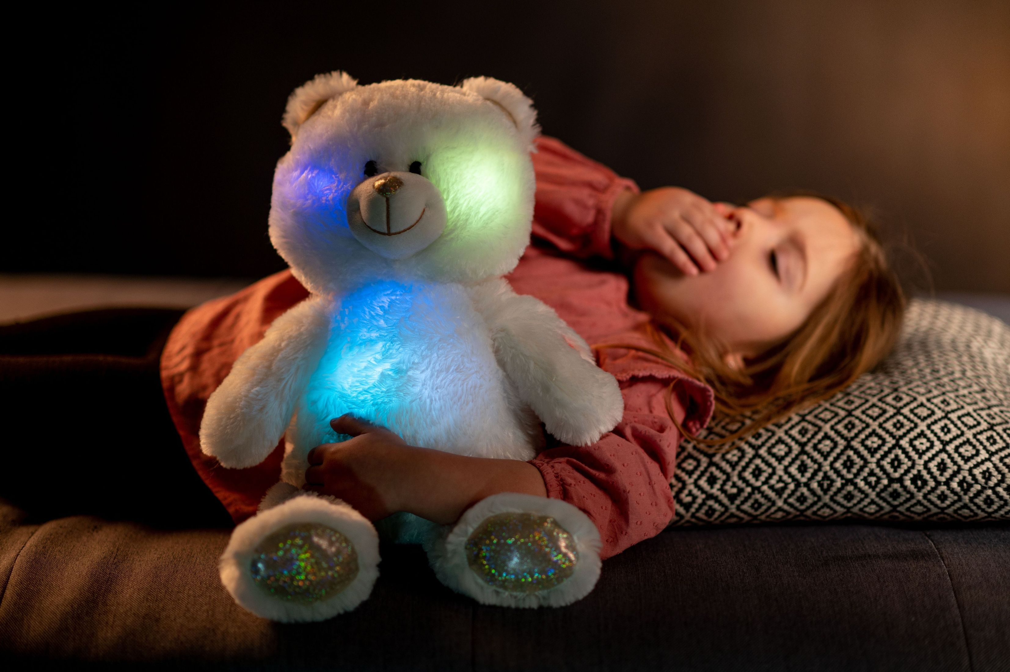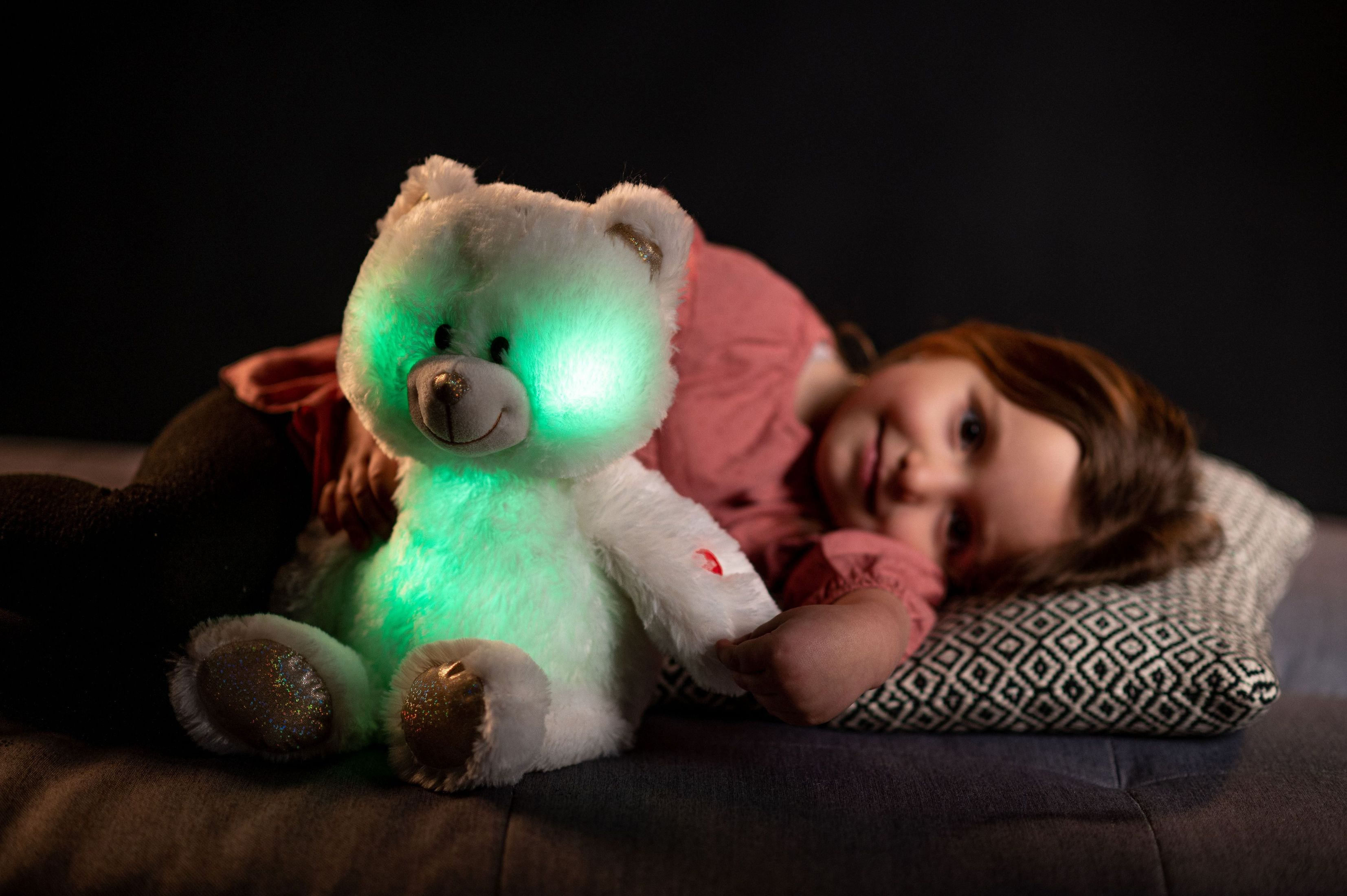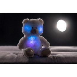 Roztomilý plyšový medvídek je vyroben z kvalitní jemné plyše. Tento plyšový kousek je ideálním dárkem! Medvídek Snílek pomáhá dětem snadněji usnout. Po zmáčknutí tlapky hraje klidnou relaxační hudbu. Ve tmě svítí a mění barvy. Velikost medvěda: 40 cm Vhodné pro děti od 3 let