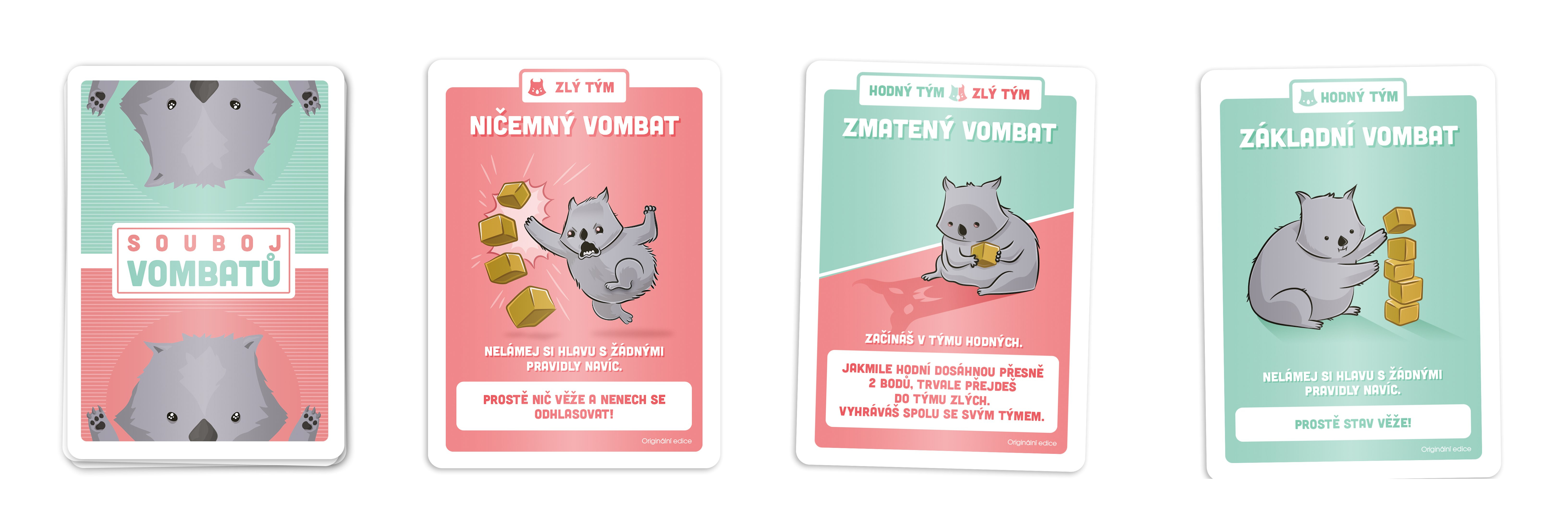 Přichází totální vombatí souboj! Buďte součástí vombatího týmu, kterému se v průběhu několika kol podaří jako prvnímu získat 3 body buď za stavění, nebo boření třech vombatích věží. Dejte však pozor, aby vás ostatní neodhlasovali ještě před koncem hry!