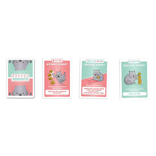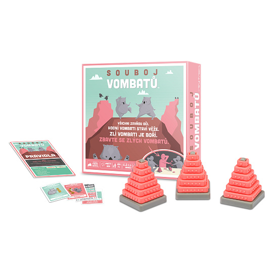 Přichází totální vombatí souboj! Buďte součástí vombatího týmu, kterému se v průběhu několika kol podaří jako prvnímu získat 3 body buď za stavění, nebo boření třech vombatích věží. Dejte však pozor, aby vás ostatní neodhlasovali ještě před koncem hry!