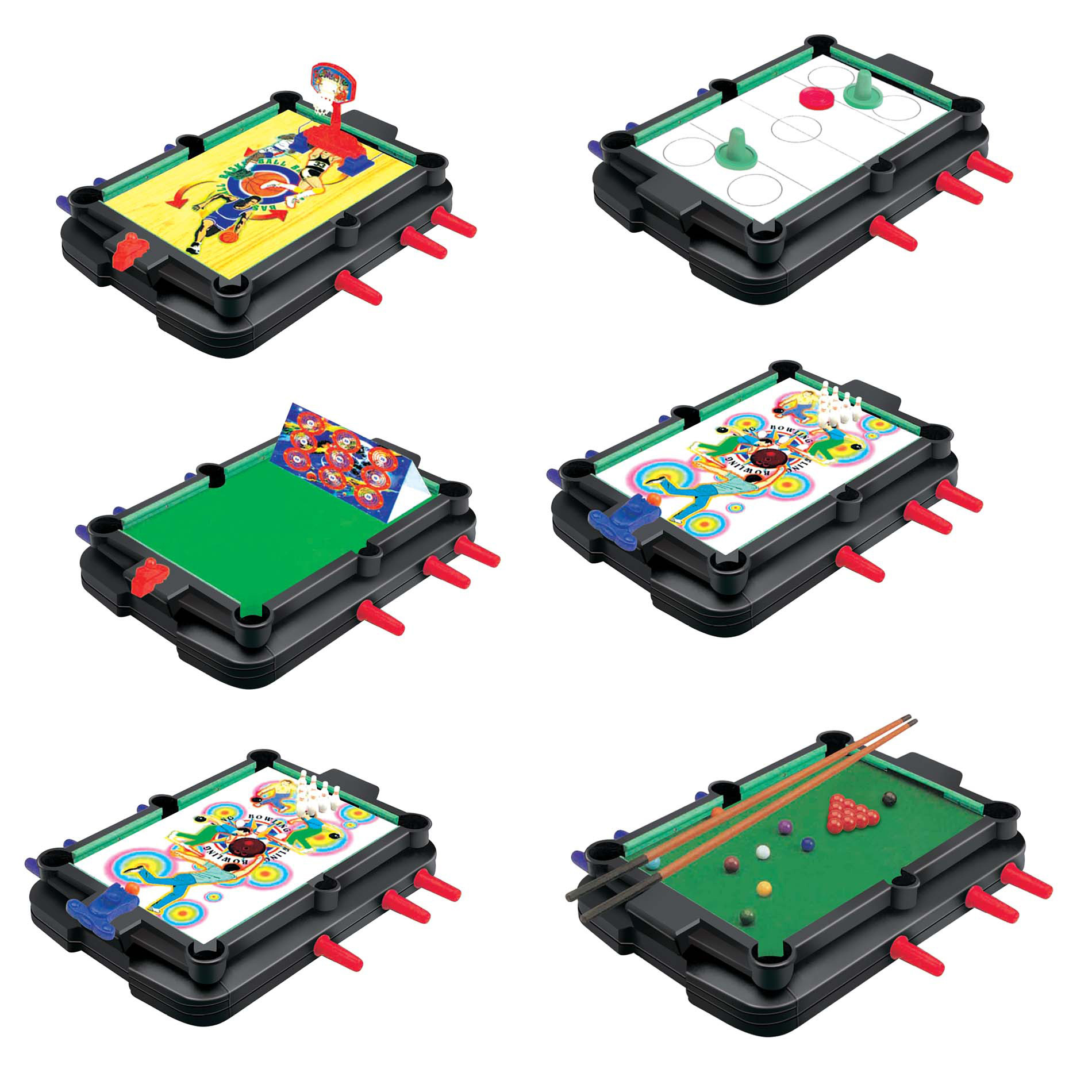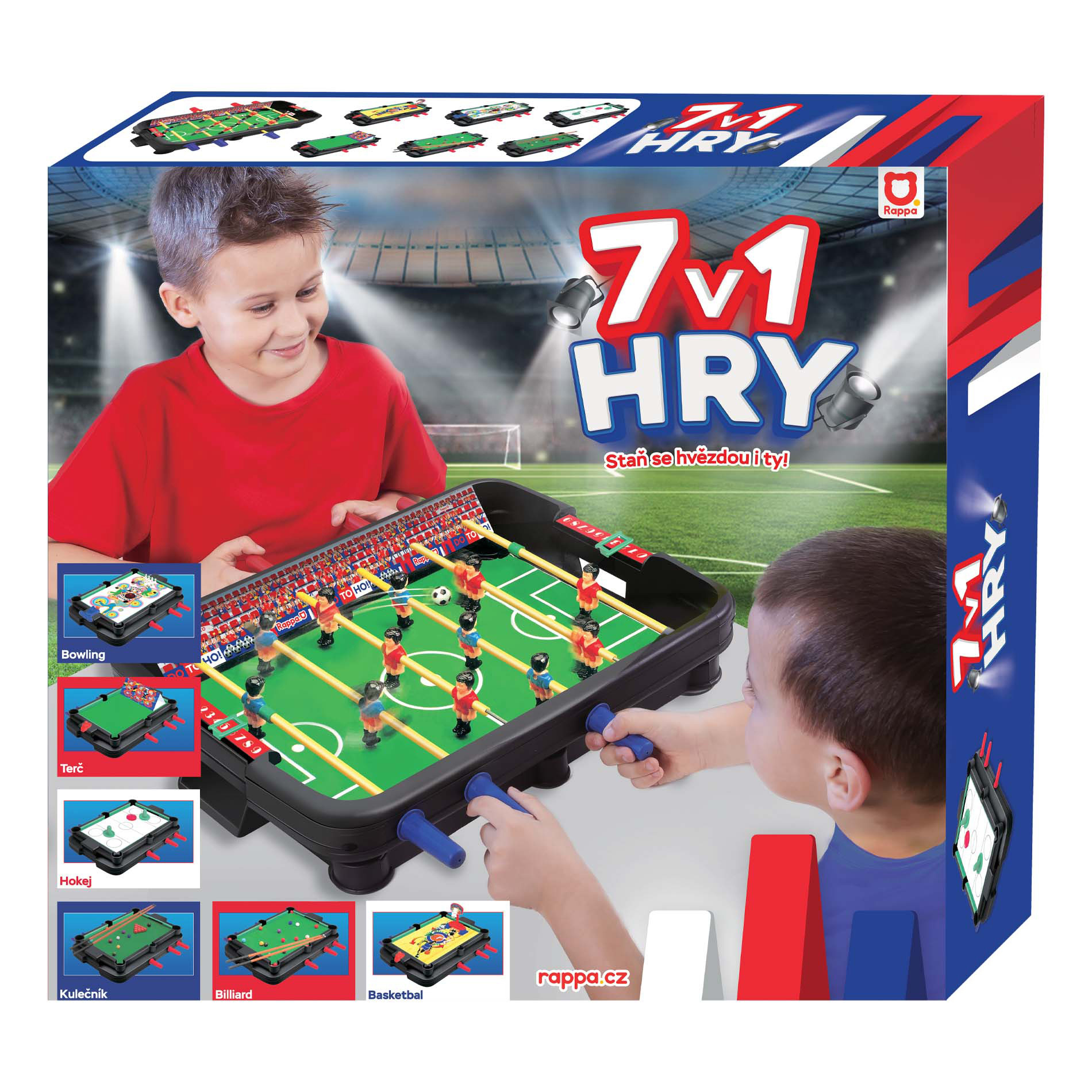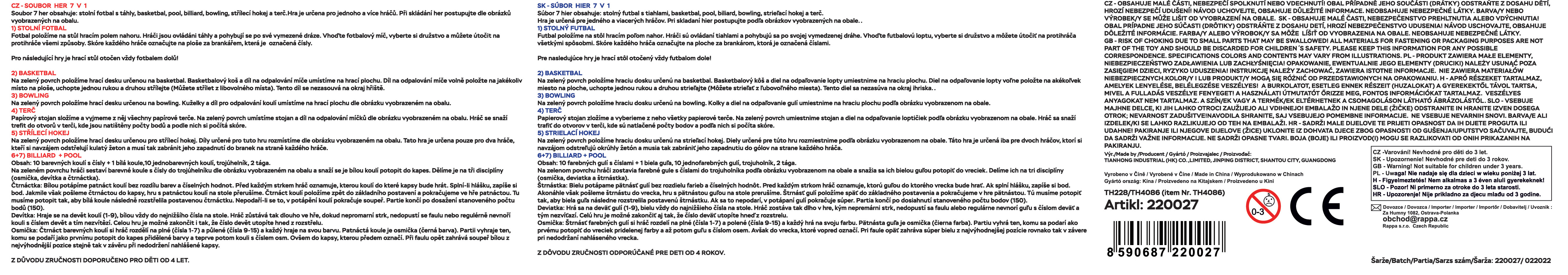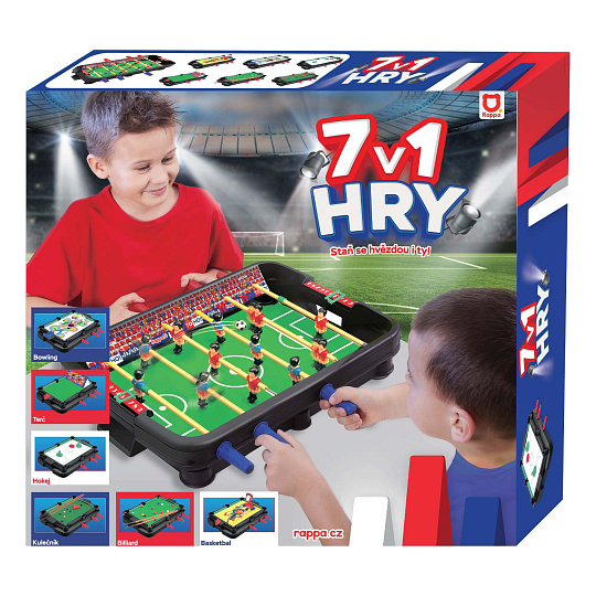 Se sestavou her 7 v 1 si lze zahrát stolní fotbálek, biliár, kulečník, střílecí hokej, terč, bowling i basketbal. Pravidla her jsou součástí balení. Zapoj své kamarády nebo rodinu do těchto senzačních her, které tě budou opravdu bavit. S touto sadou her se vyřádíš! Rozměr hrací plochy je cca 36 x 24 cm. Fandíme na mistrovství! UPOZORNĚNÍ! Poškozený přepravní obal (krabice, polystyren či plastová folie).Jedná se o nový, plně funkční výrobek, na který se vztahuje standardní, minimálně dvouletá, záruka.