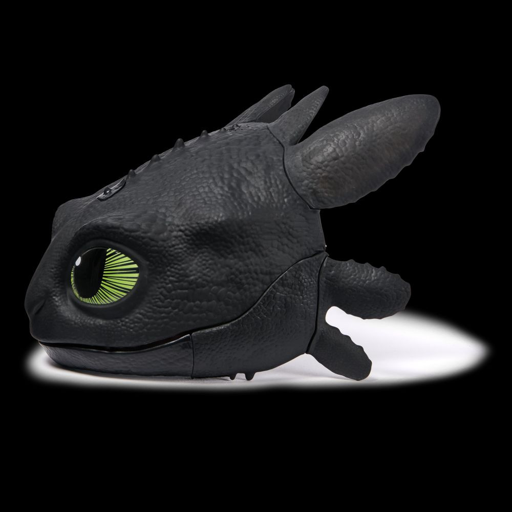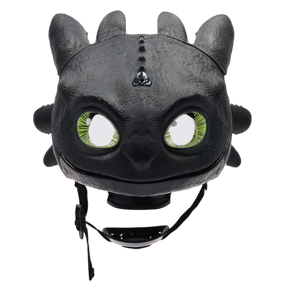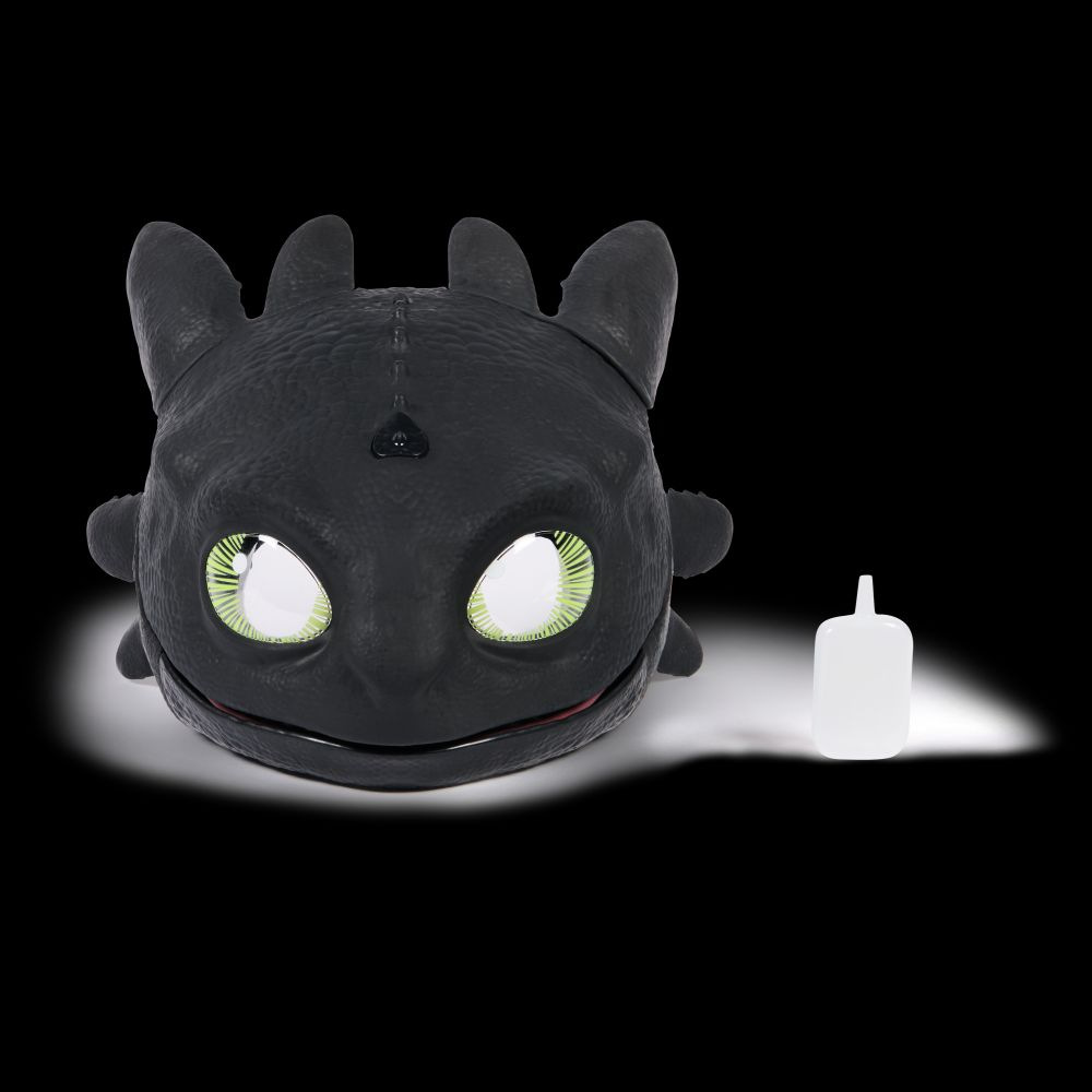 Interaktivní maska Bezzubky. Po nasazení na hlavu upevníte pásek kolem brady. Následně pak otvíráním vašich úst aktivujete zvukové a světekné efekty. Maska dokonce umí chrlit páru imitující kouř z dračí tlamy.